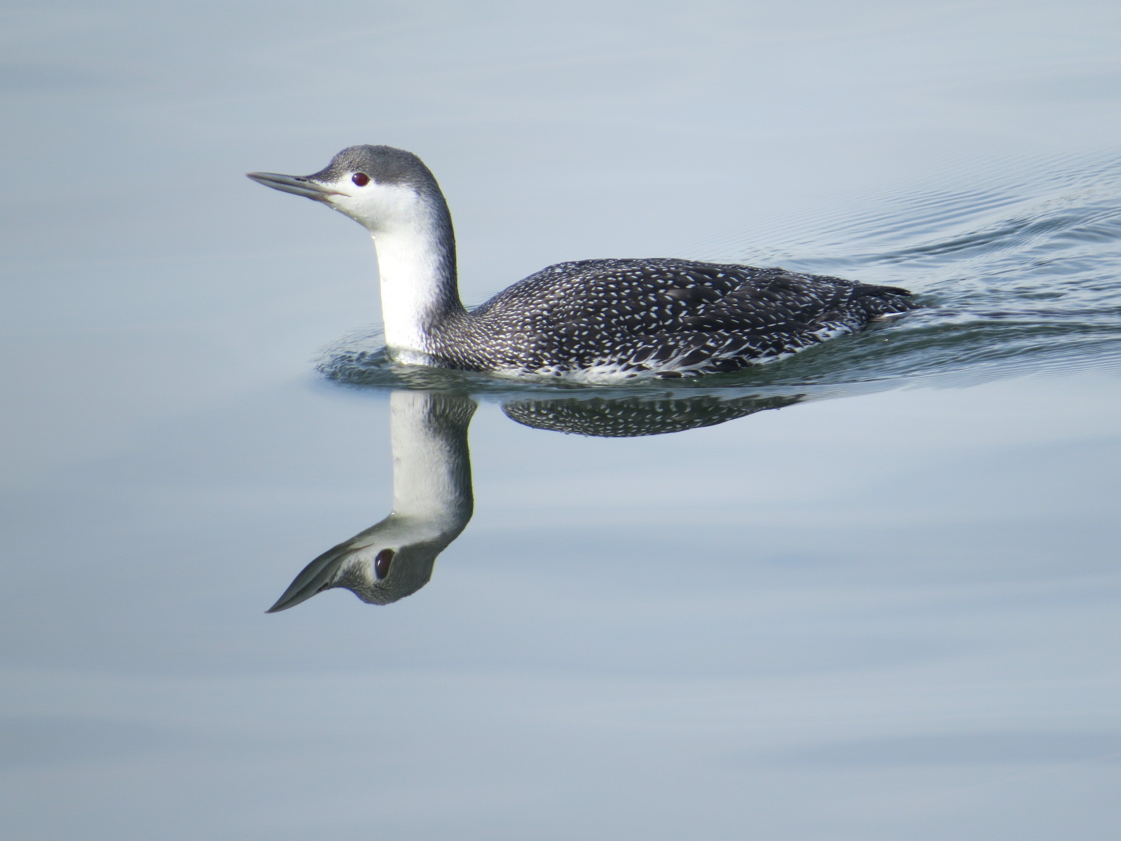 My closest-ever encounter with a Red-throated Loon (Gavia stellata). In the calm waters of Erie Basin in Red Hook. The bird’s upturned bill and smaller size helps to distinguish this species from the Common Loon (G. immer), which in roiling winter waters at silhouette distance is still a challenge. The “red-throat” is part of breeding plumage, so it’s too soon for that, and something we aren’t likely to see in these parts since they breed in the high Arctic.