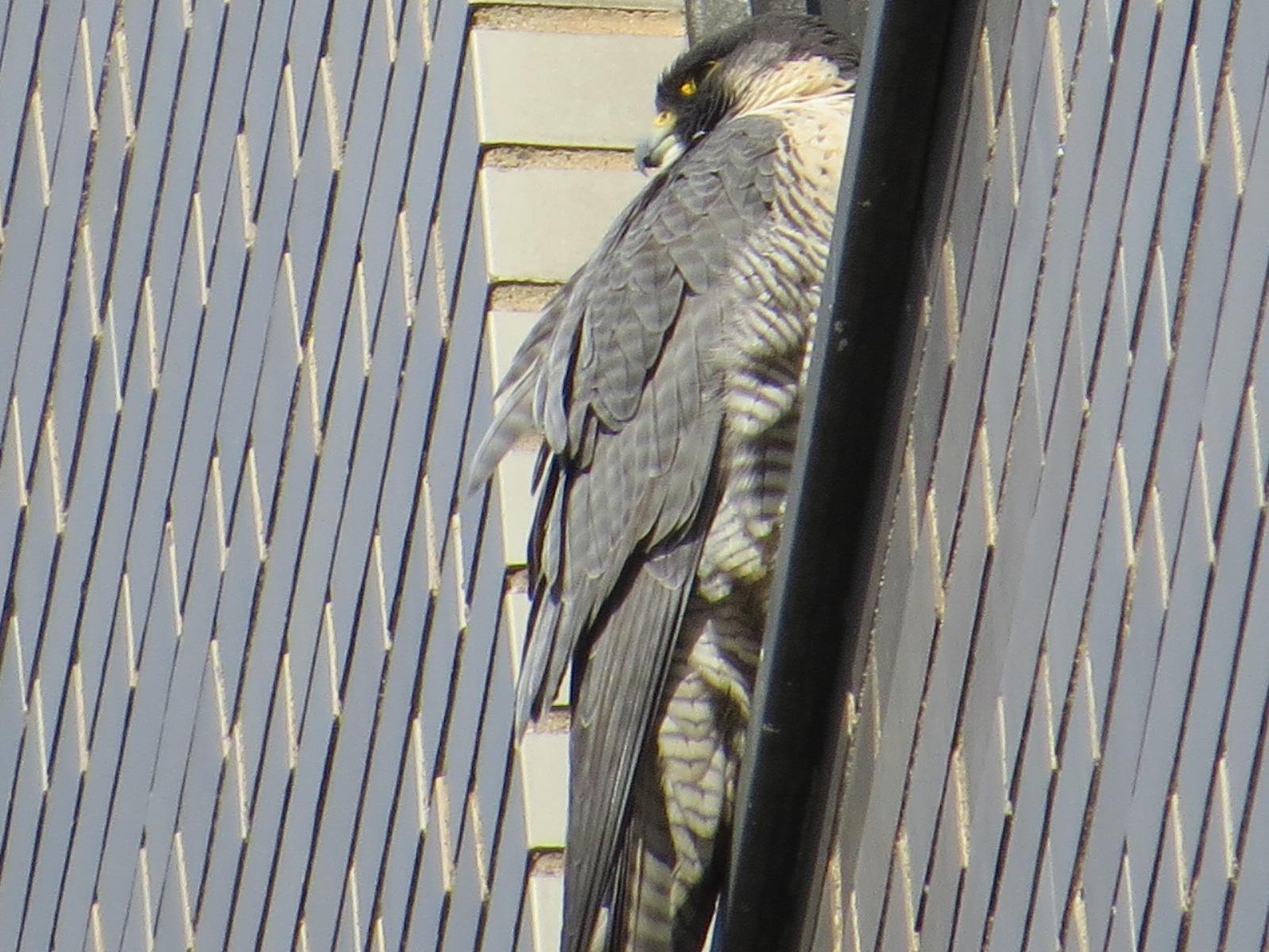My worries about the foot of one of these Brooklyn falcons seem to have been misplaced. Standing on one foot with the other foot drawn up is SOP for Peregrines. A follower of my Twitter told me her parrot does the same thing. As it happens, genetic evidence now suggests falcons (Order Falconiformes) are more closely related to parrots (Psittaciformes) and songbirds (Passeriformes) than to other hawks. Taxonomy, long-based on “looks-like” anatomical similarities, is being revolutionized at the genetic level.