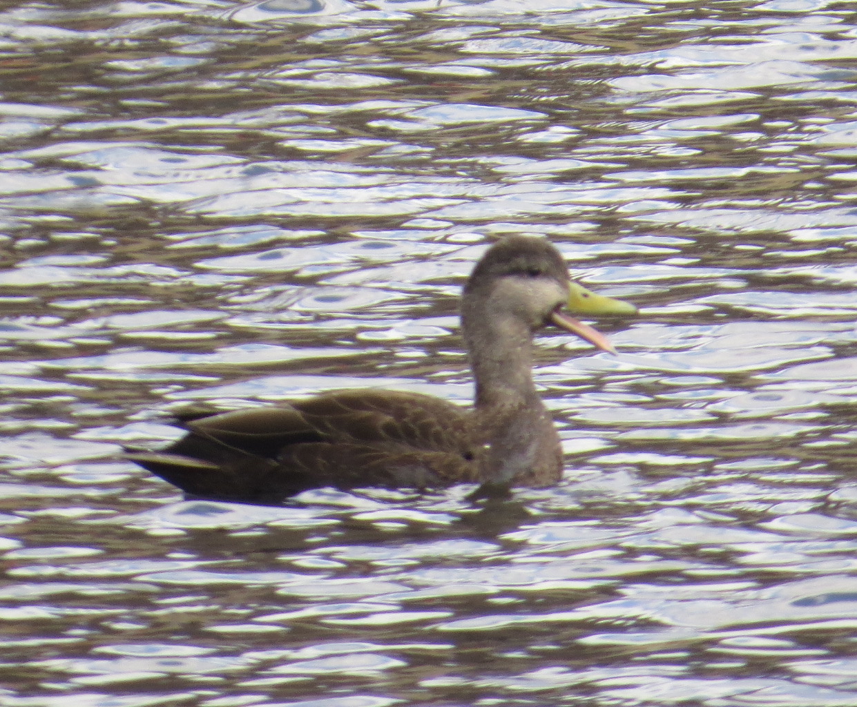 While observing these ducks, I happened to glance away, and then looked up as I heard a splash. Two American Black Ducks landed (watered?), one with a Red-tailed hawk hot on its tail. Not exactly a duck hawk, one of the old names for Peregrines, the Red-tail missed as the duck took shelter underwater.