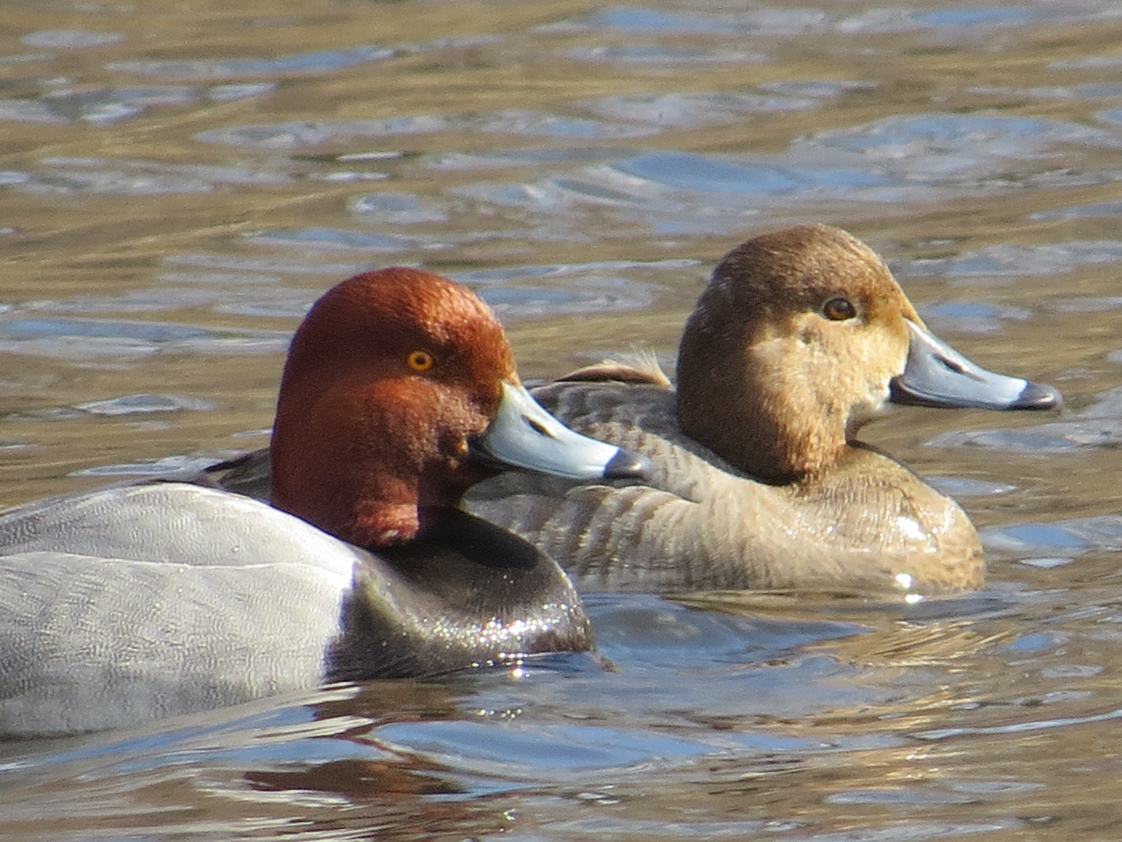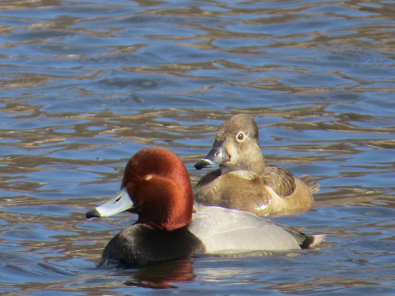 A pair of Redheads (Aythya americana) in Green-Wood. The male, in front, sports that beacon of a head. These two, along with two slightly smaller female Ring-necked Ducks (Aythya collaris), very craftily kept their distance from me as I circled the blob-shaped Valley Water twice, as I aimed for the best distance and light.