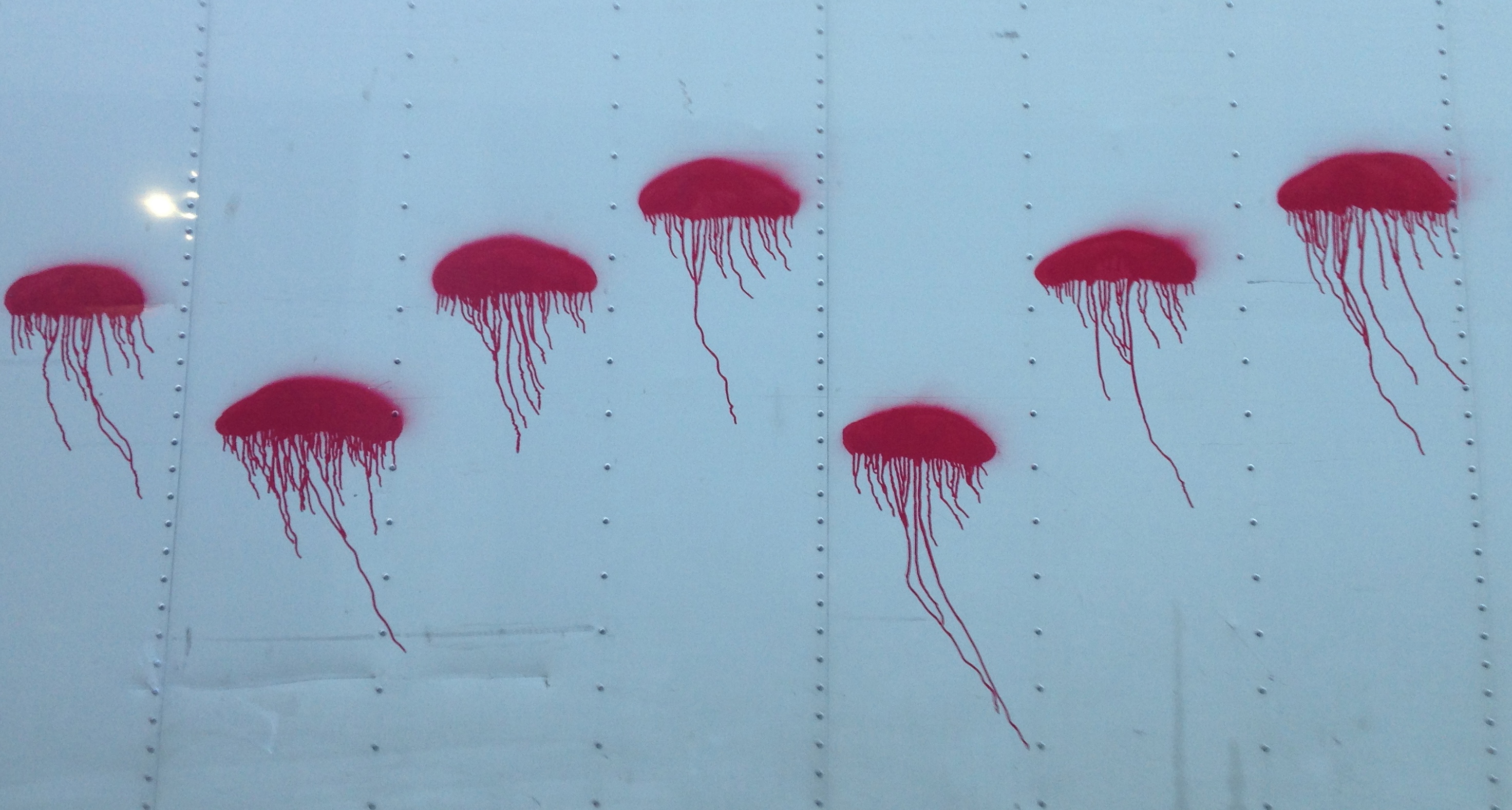 An analogy Gershwin borrows from some other scientists: we aren’t just extracting the capital from the bank of the sea, we are burning down the bank, destroying those breeding grounds of future generations of sea life in the coral reefs (tropical, and the little known cold-water reefs), mangrove swamps, saltwater marshes, etc. Like weeds, the jellies come upon our ruins and feast, growing wildly. For every pound of seafood, ten or more times that weight is wasted, crushed, killed, rotted; this “bycatch” includes mammals and seabirds. Thousands of miles of “ghost nets,” and barbed long lines continue to float through the sea, lost from ships, but continuing to trap and kill. Recall all those false alarms in the Pacific and Indian Ocean over that missing plane; oil slicks and garbage far, far from humans (and that’s just what we can see — many of the most deadly things are invisible). And all that CO2 we’re pumping out, a good portion of it is absorbed into the oceans, radically changing them. Starry-eyed amoralists dream of terraforming other planets; we are recreating the primal seas of algae and jellies right here. The grim news goes on and on, cascading. Thalassa, Thalassa!