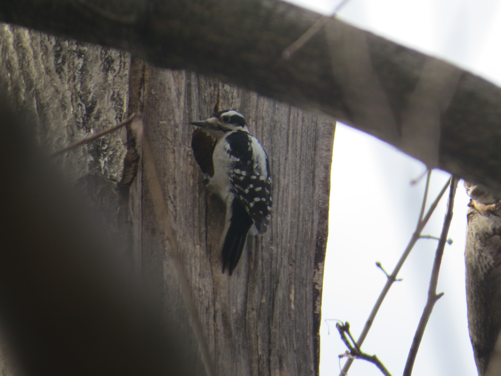 A female Hairy Woodpecker (Picoides villosus). Less common in our area than the smaller but otherwise very similar Downy Woodpecker. I find that the best way to differentiate these species is to look at the bill/head size ratio. Note how this bird’s bill is almost as long as her head; the Downy’s bill length is smaller than its head length.