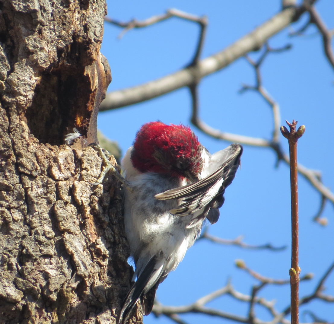 You can see how the red feathers of the head have really come in since January, as the bird has aged out of its first year plumage. Not completely, but getting there. The mature birds look like flags, solid bands of red, black, white. Red-headed males and females look alike, by the way, which isn’t the case with our other, more familiar woodpecker species (Downy, Hairy, Red-bellied, Yellow-bellied, and Northern Flicker).