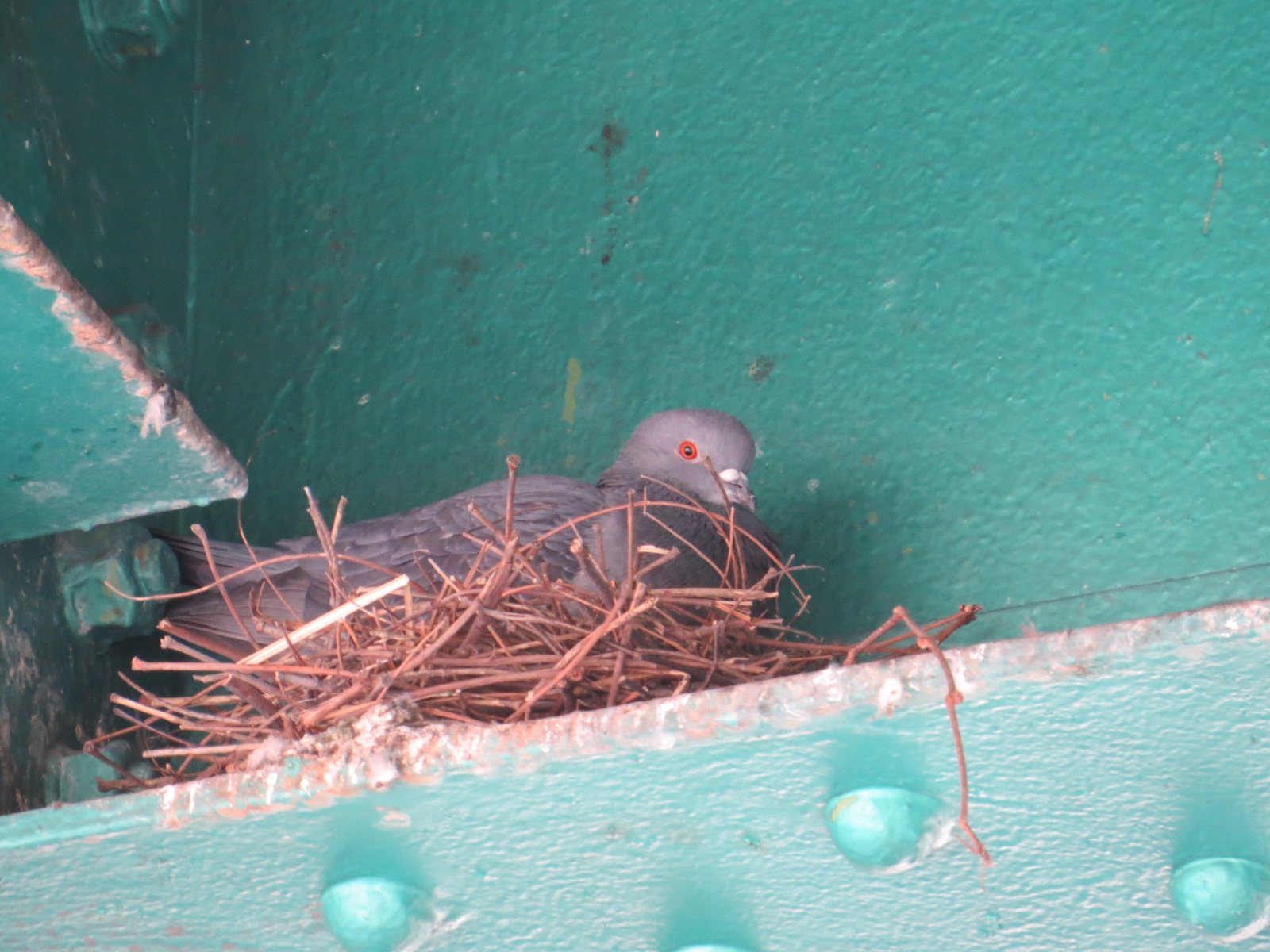 Rock Pigeon (Columba livia) nesting under the bridge. The bird was still working on the nest, using her body to shape these freshly collected twigs. The red-eyes are natural, not from a flash.