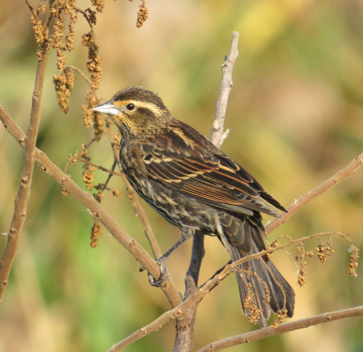 A female Red-winged Blackbird (Agelaius phoeniceus). An example of one of the most extreme sexual differences found among species in our area.