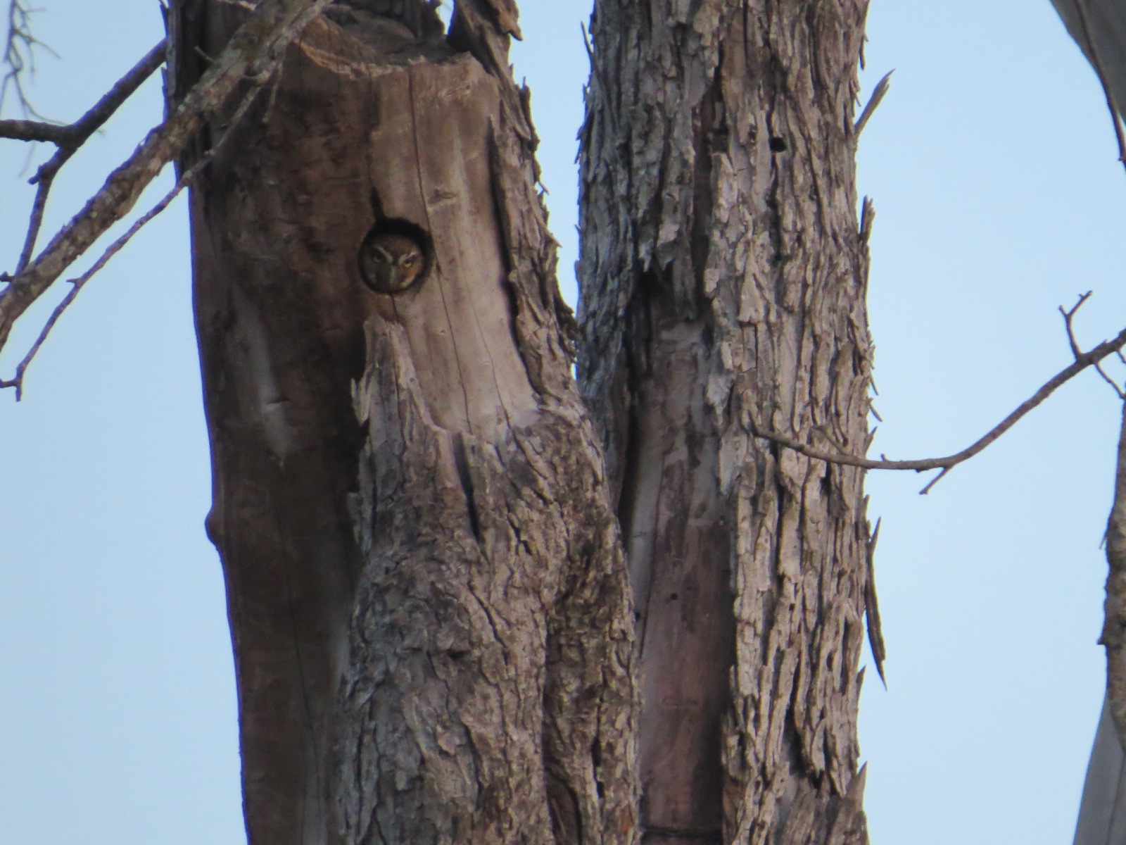 “Owl in the hole!” The distinctive “eyebrows” are visible even in this long-shot in low light. The other half of the pair showed up just as our human vision began to fail in the dark. We heard the birds calling as they prepared to hunt through the night.