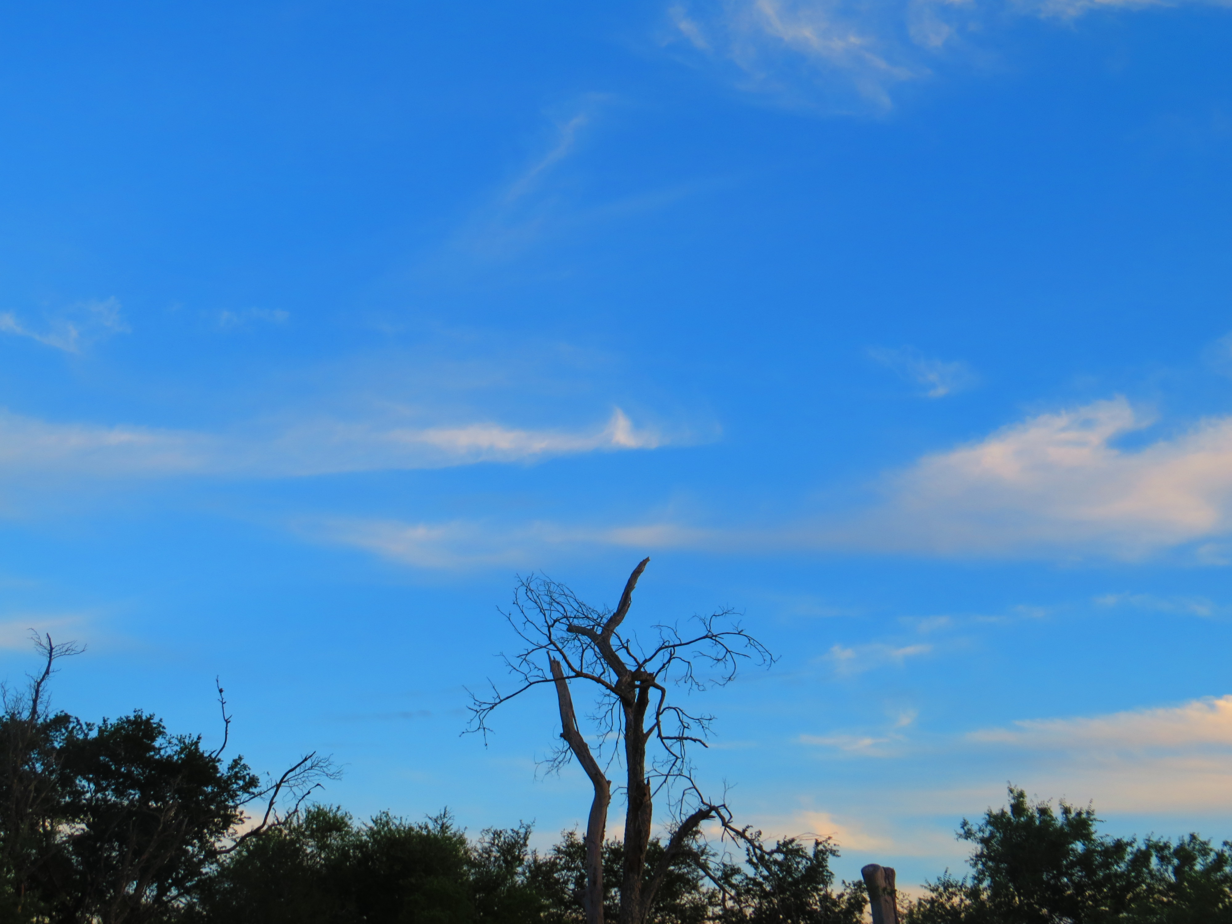 Twilight. We were in Bentsen State Park, looking for Elf Owls (Micrathene whitneyi). These are our smallest owls, 1.4oz (compare with House Sparrow, .98oz, and Great Horned Owl, 3.1lb). There was a nest in a snag, perhaps originally carved out by a woodpecker. An owl was periodically poking out as the sun set.