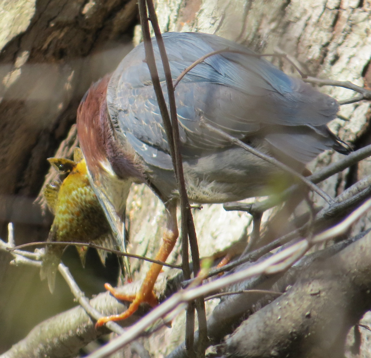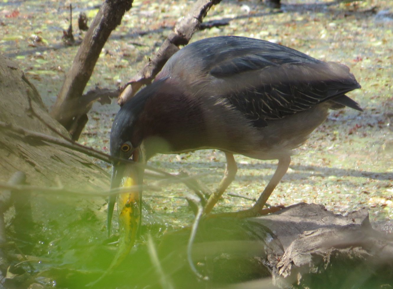 A Green Heron (Butorides virescens) was wrestling with a big fish it had caught today at the Upper Pool.
