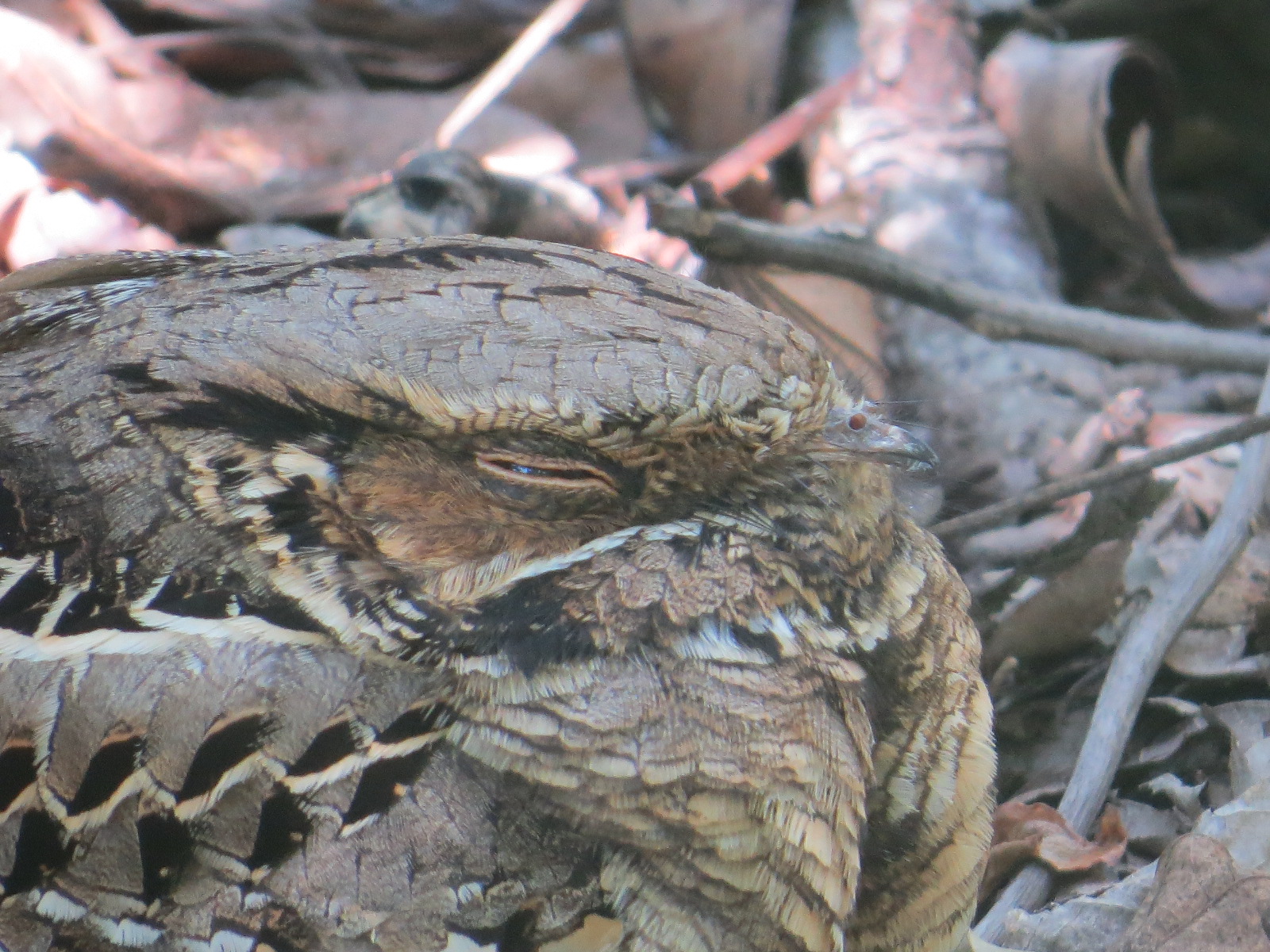 There is also the Common Pauraque (Nyctidromus albicollis). This is a ground-roosting species common throughout the American tropics and just a little tiny bit of the U.S. We saw some at Estero Llano Grande State Park. One was with her two young; the birds were so well ensconced in the brush they were hard to see and impossible to photograph. You can see how their plumage mixes in with leaf-litter. But this bird was much closer to the path: