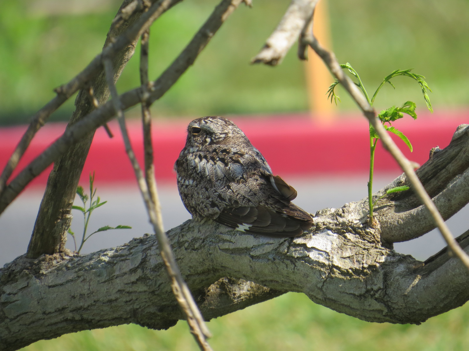In addition to the nightjars, which are more fully nocturnal, the Caprimulgidae also include the nighthawks. These birds are more active at dawn and dusk, and with their pointed wings and swooping flight look rather hawkish, specifically falcon-like. The Common Nighthawk can be seen over Prospect Park. The Lesser Nighthawk (Chordeiles acutipennis) is found only in our Southwest (and further south). We saw some of these overhead in Bentsen State Park at twilight, but got a really good look at one flying in the afternoon at the South Padre Island Convention Center (a birding hotspot, with garden and boardwalk). On our way out of the Convention Center grounds, which was host to a vroom-varoom! motorcycle convention, we saw this Lesser perched: