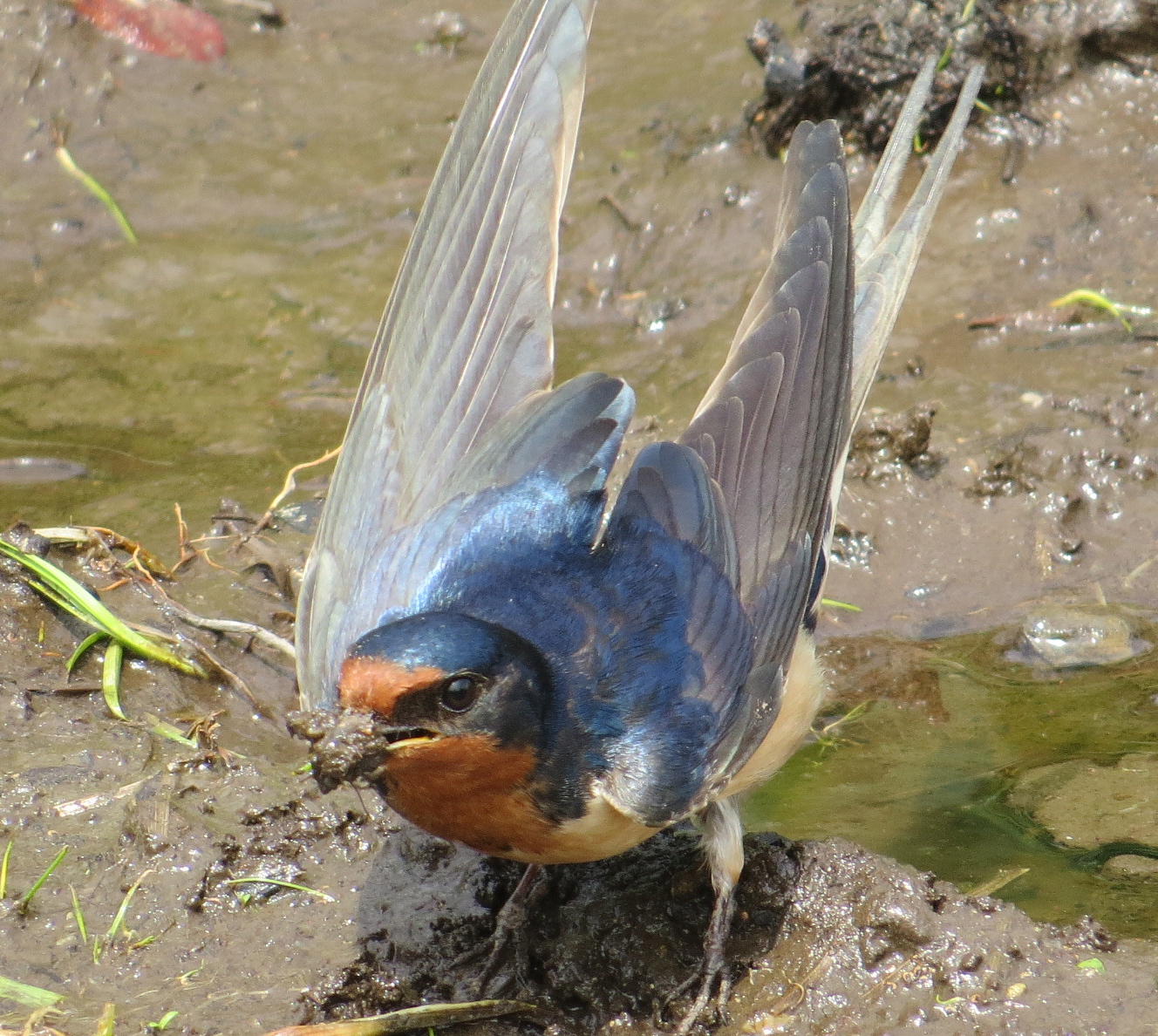 It’s rare to get a good solid look at a Barn Swallow (Hirundo rustica), considering they zip through the air at great speed most of the time in pursuit of flying insects, but a pair were gathering mud recently for their nest.