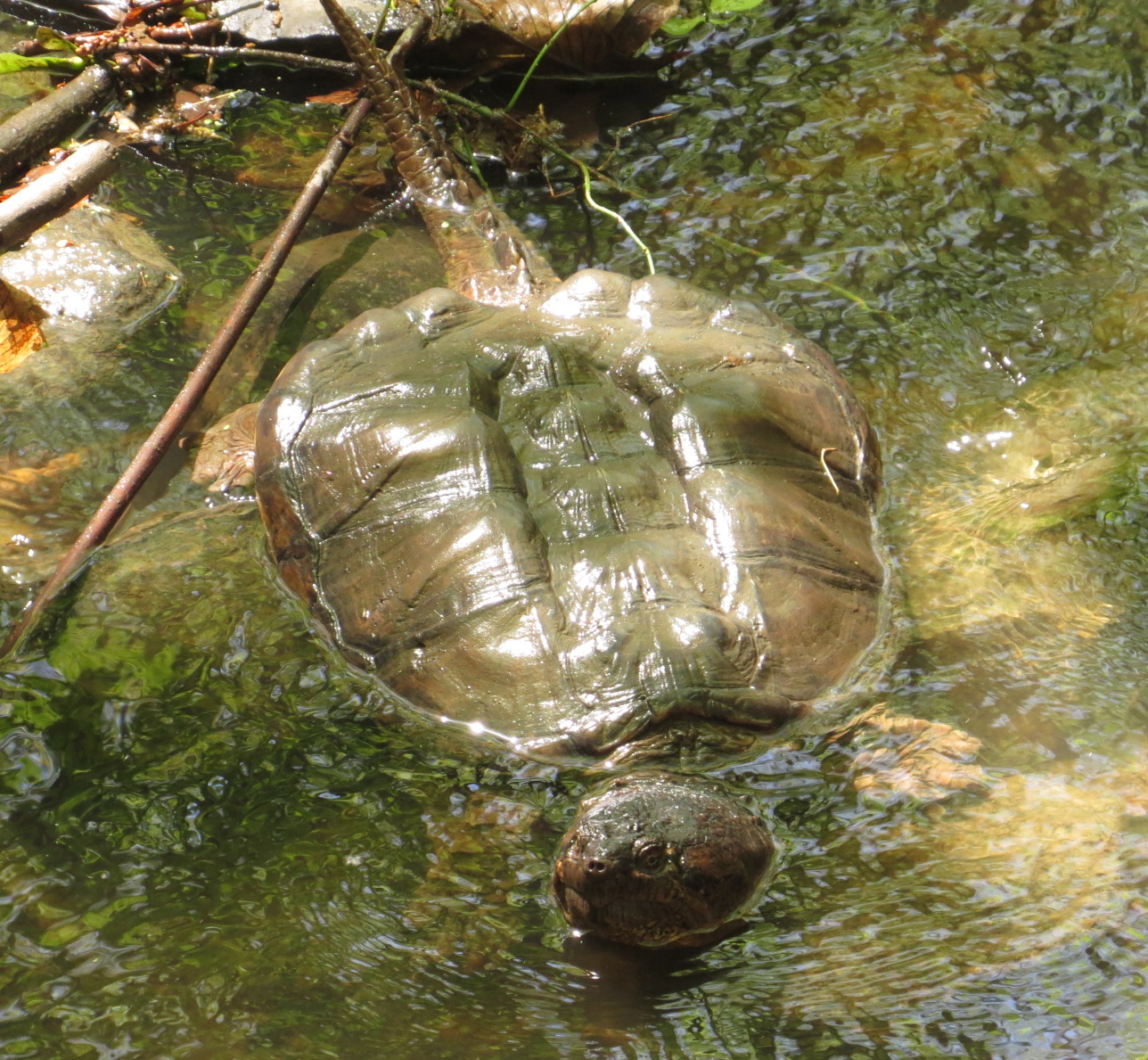 Bigger, much bigger: Snapping Turtle (Chelydra serpentina). Possible looking for a place to exit the water and lay eggs (you need another reason to enforce the leash law in our parks?). Judging by the shell, I’d say I’ve seen this giant before. Also, even enormous Snappers start small; here’s a baby I found in Mass a couple of years ago.