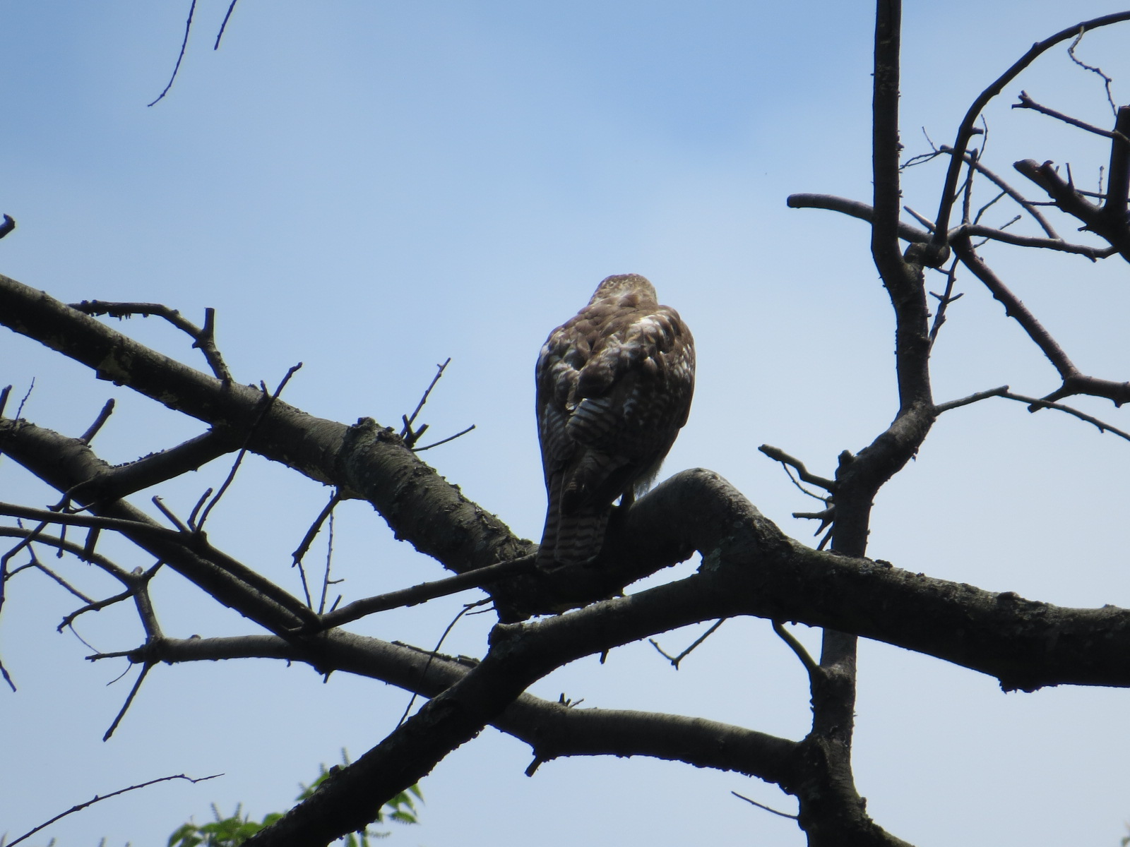 Sometimes you don’t get a great view. Also, this Red-tailed Hawk (Buteo jamaicensis) is one of last year’s fledglings, so it’s still too young to have the red, which is really russet- or brick-colored, tail. But those rough, white, V-like markings on the back are an excellent clue to the identification of this species, at least on the East Coast.