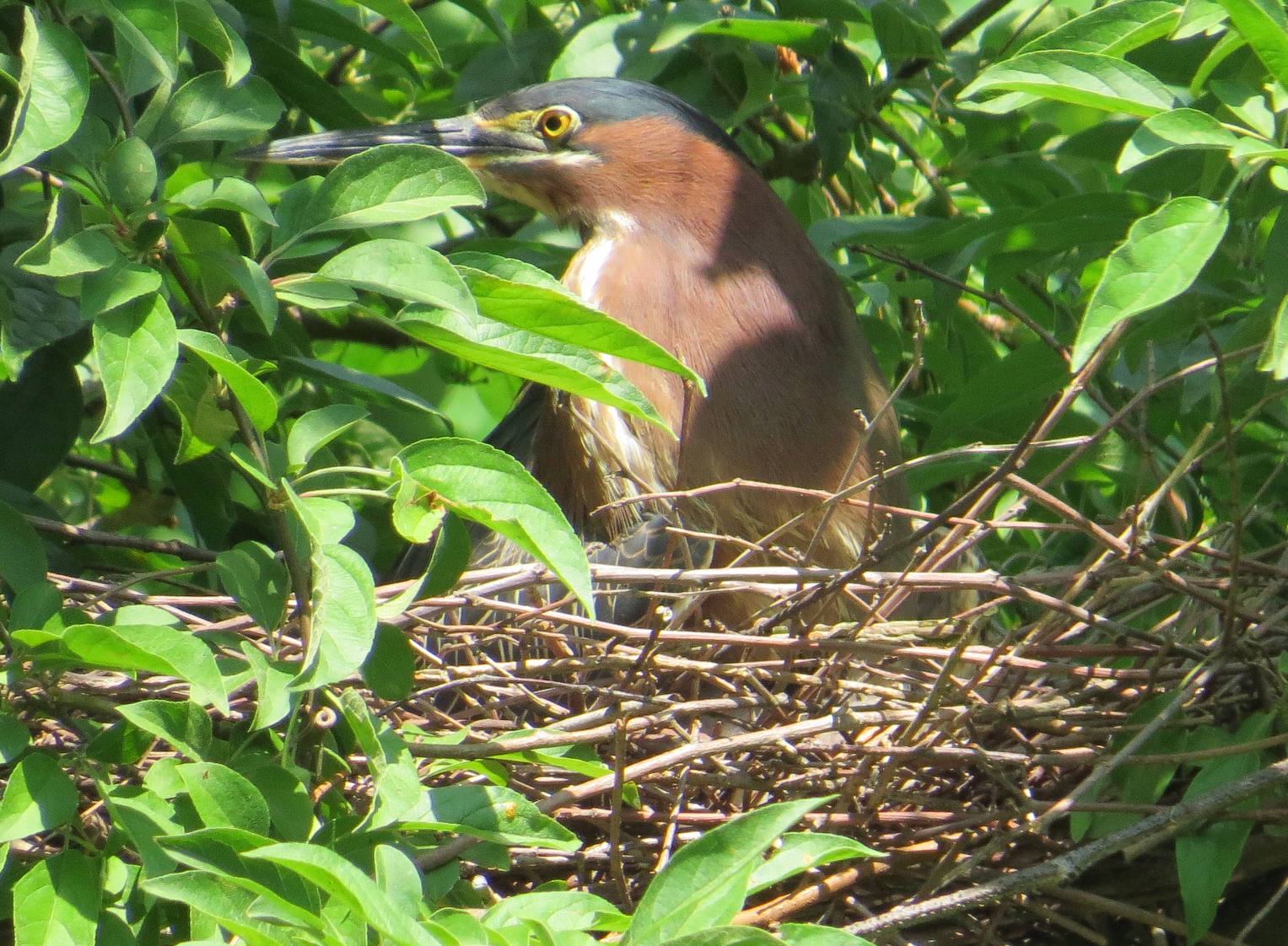 The Green Heron (Butorides virescens) was the only one of these three not hunkered down when I arrived. The bird was grooming itself — could be either male or female — before hunkering down again on the eggs.