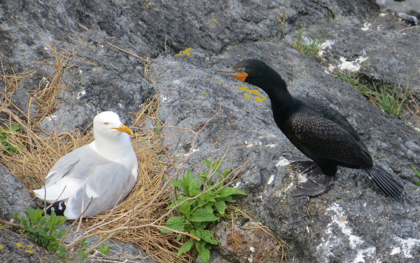 Meanwhile, this was another situation nearby. The Double-Crested Cormorant flew in to see if, maybe, there were any, you know, eggs! lying around to snack on? The gull made a lot of noise, the Cormorant did a little bobbing and weaving; when the gull refused to budge, the Cormorant flew off.