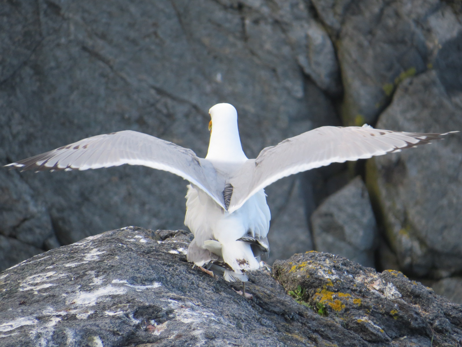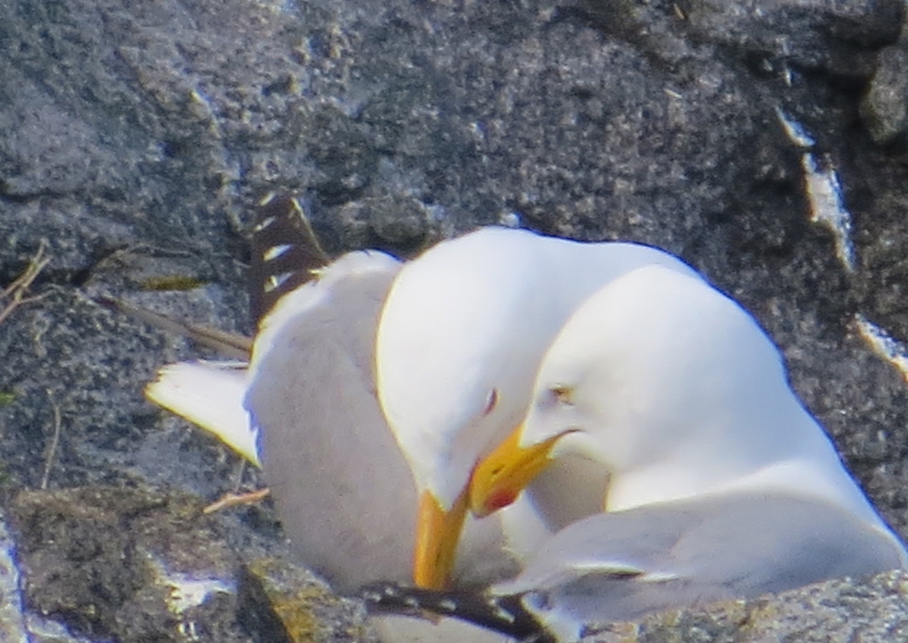 Bird sex is usually a very brief affair, a quick connection between cloaca. They may make this contact many times over the course of a day, or three, but the actual hookup itself is a matter of seconds. Sperm is transferred without benefit of a penis (except in the case of ducks and a few other species). Someone somewhere has called this the “cloacal kiss,” which is less than poetic if you know your Latin (a cloaca is a sewer). But these Herring Gulls (Larus argentatus smithsonianus) on White Head on Monehegan went at it for a good long while, as bird sex goes, a minute or two.