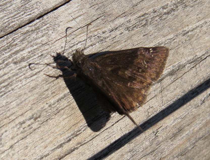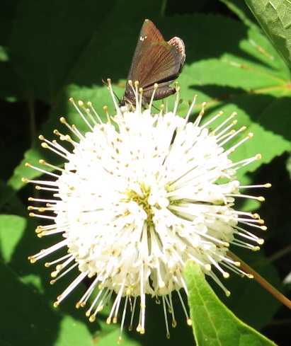 Common Sootywing (Pholisora catullus) hitting the light just right on pollinator-magnet Buttonbush (Cephalanthus occidentalis).