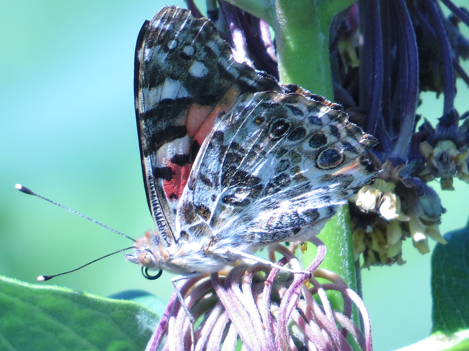 Painted Lady (Vanessa cardui). I’ve posted previously about separating these from the similar American Lady butterflies (Vanessa virginiensis); from this view, the four big wing spots mark the Painted; two big spots the American.
