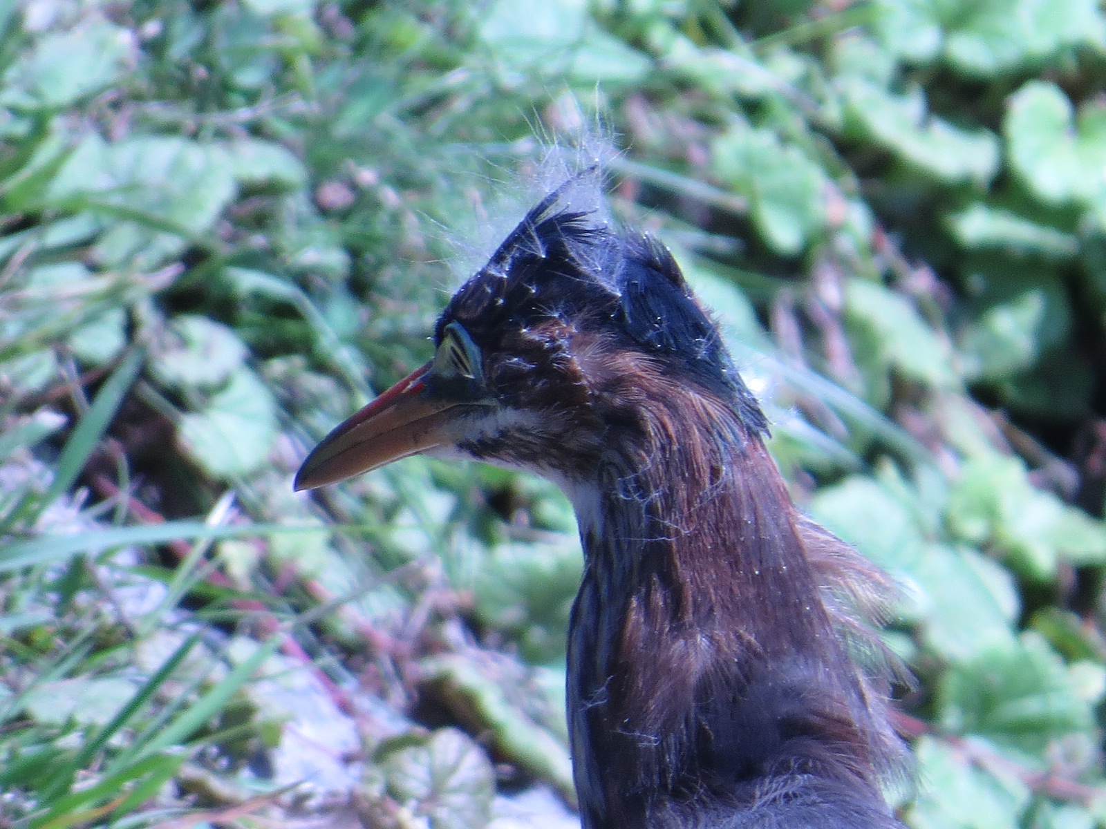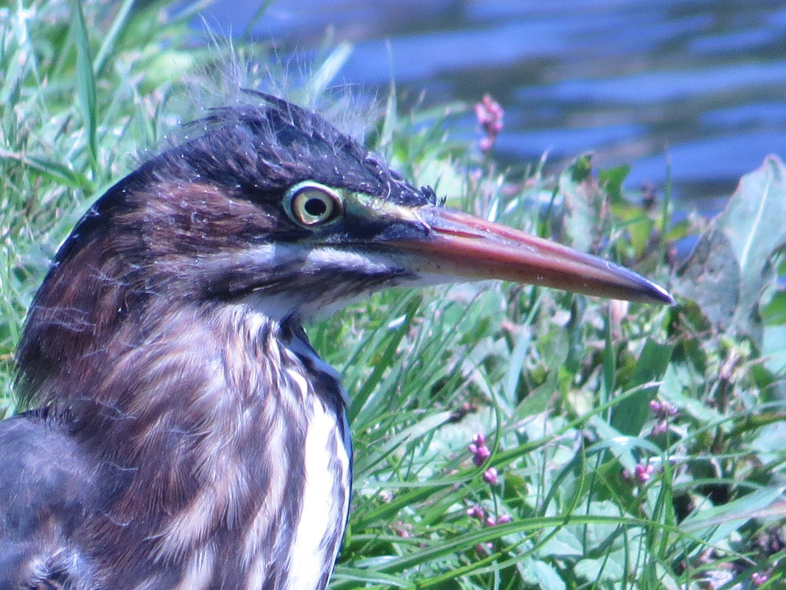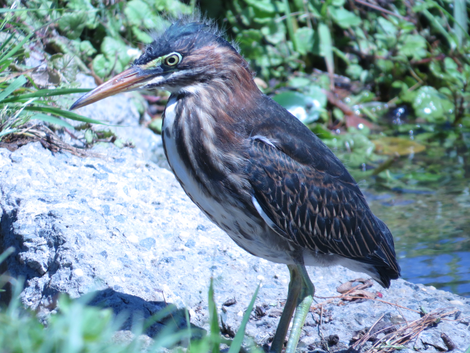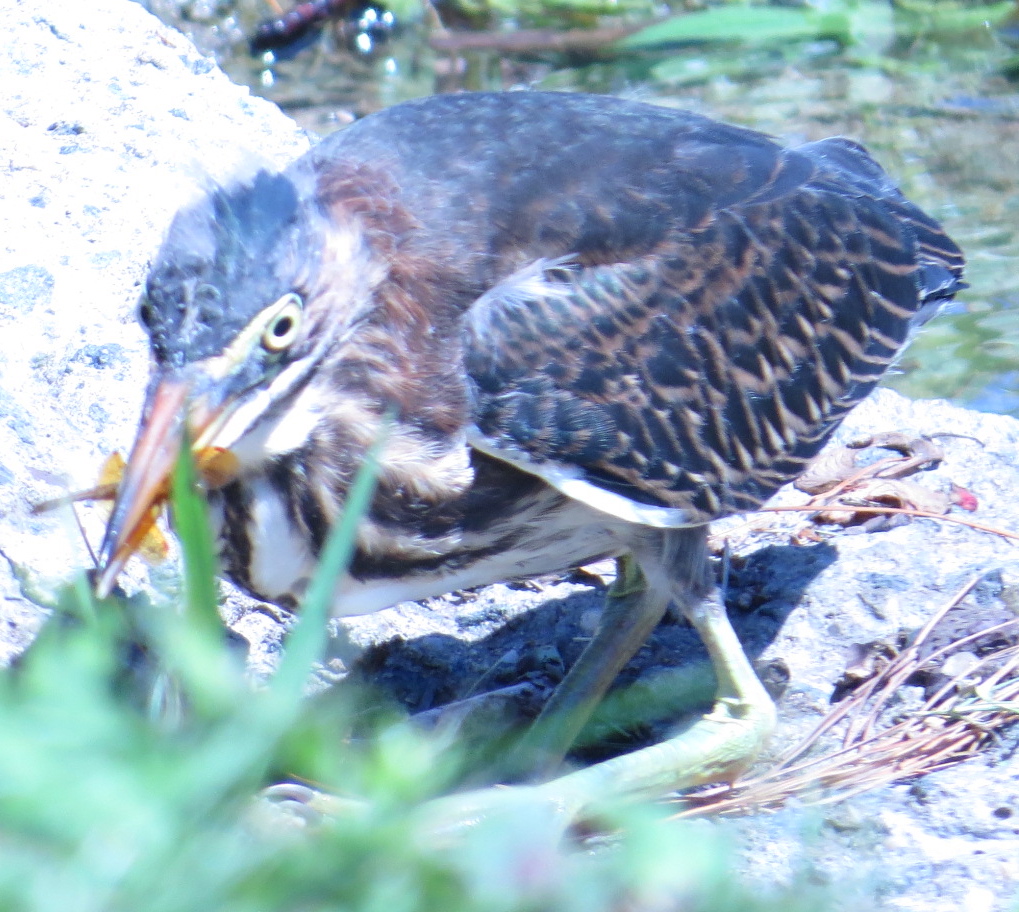 My eyes were intent on the edges of the pond, alive with damsel- and dragonflies, so I didn’t see this young Green Heron (Butorides virescens) until it darted away on foot. It didn’t go very far, though. I watched it for a long time as it stalked back and forth along the pond.