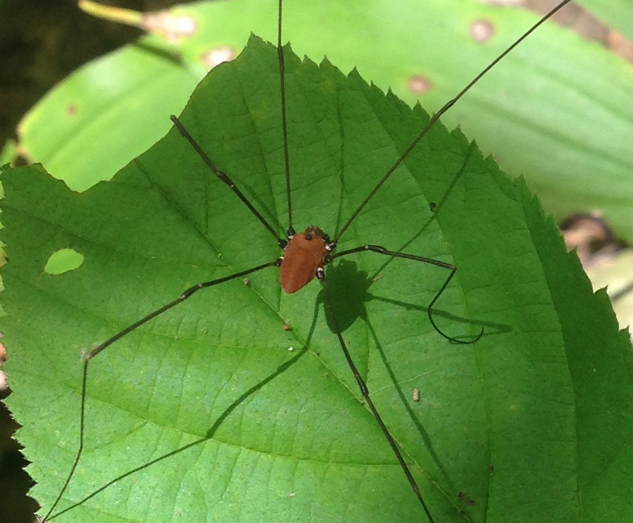 Daddy-, or Granddaddy-longlegs… but wait a minute. There are only six legs here. The Opiliones order of harvestman are related to spiders and have eight legs. What’s going on?