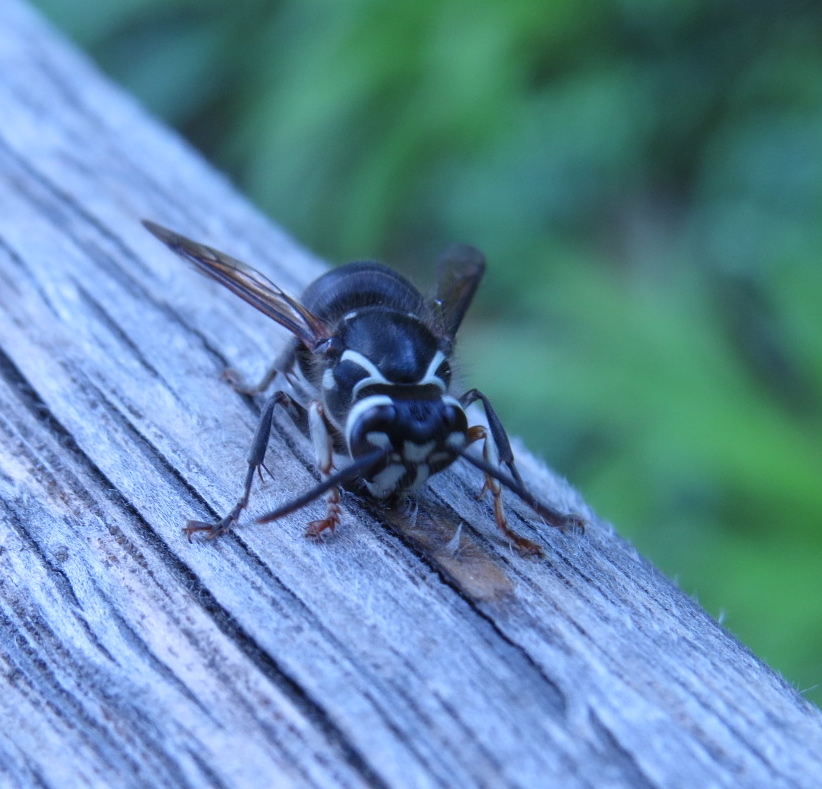 Bald-faced hornet (Dolichovespula maculata) cutting away at the black locust hand-rails at the Native Plant Garden at NYBG.