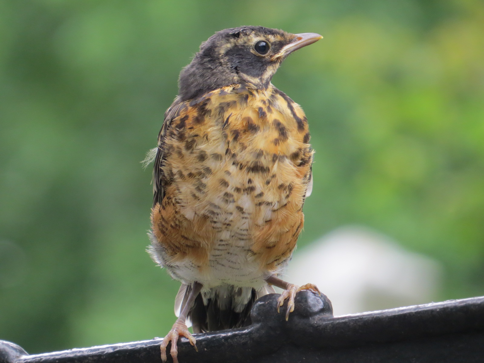 Late brood young American Robin. The binomial Turdus migratorius may raise an eyebrow, but Turdus is just the Latin for “thrush.”