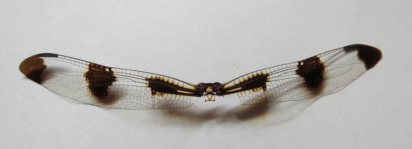 Forewings of female Twelve-spotted Skimmer (Libellula pulchella). I found this with a little bit of thorax exoskeleton a few blocks from home. Extremely lightweight, and prone to blowing away in a weak breeze.
