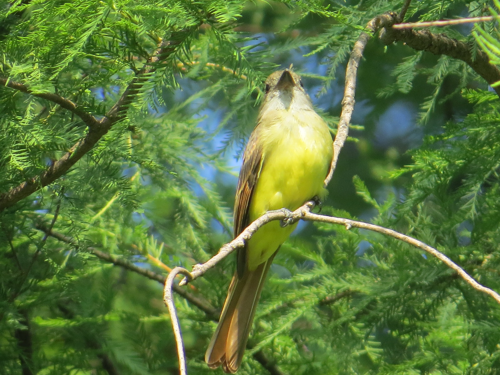 Always a nice surprise to get a good look at a Great Crested Flycatcher (Myiarchus crinitus), since they are usually at tree-top level. I thought this might be a migrant, and it may well be, but it should be noted that there are breeding records for the species in Prospect. They are the only cavity-nesting flycatcher in the U.S. The bright sun is making its neck look too white; the birds are more gray in the feather.