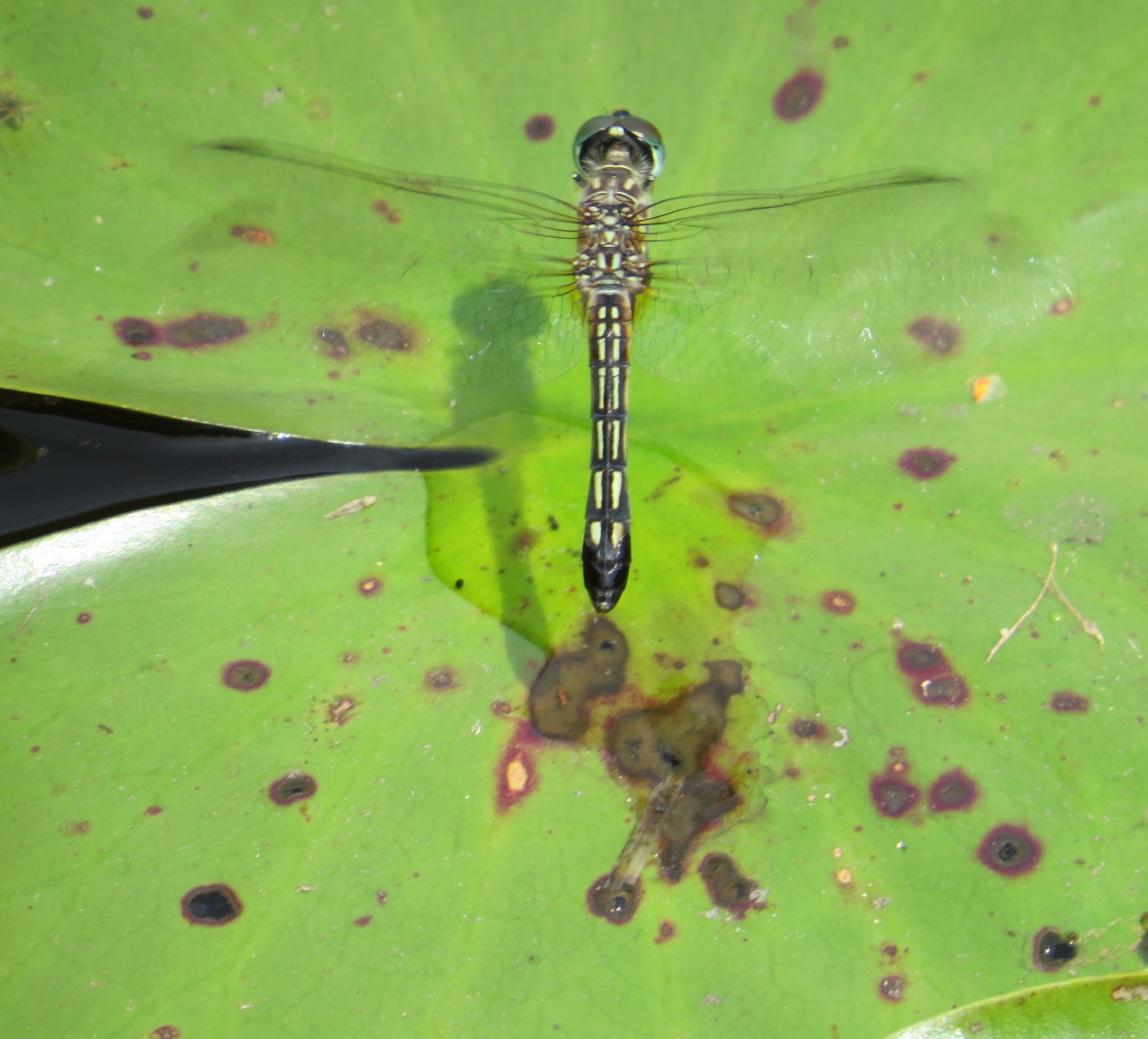 A female Blue Dasher (Pachydiplax longipennis) dipping her abdomen down to lay fertilized eggs in a bit of water floating on a lily.