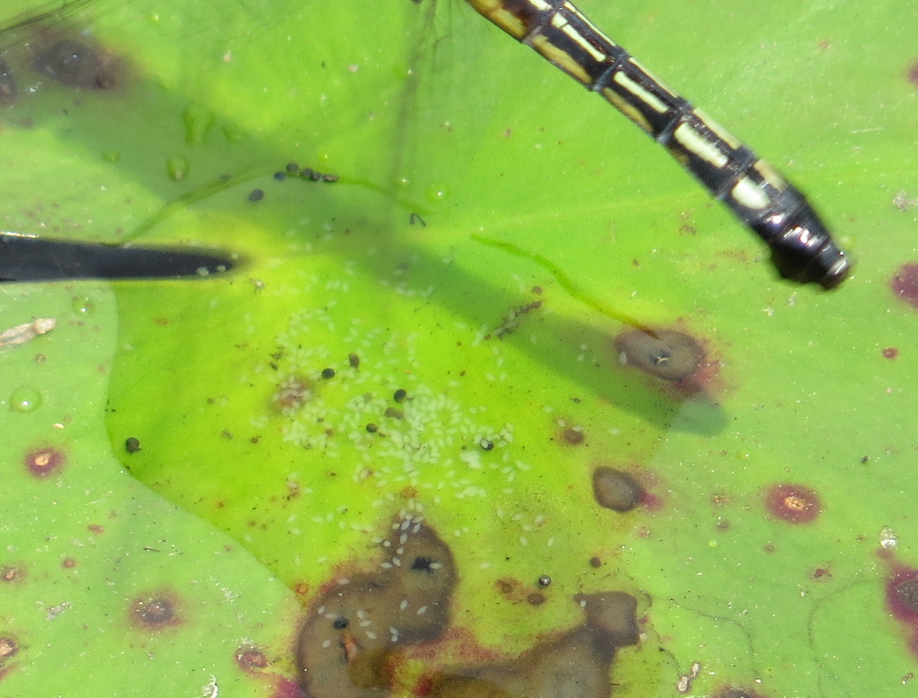 Blue Dasher females don’t seem to need chaperones. And look at all the eggs! Like pieces of short-grain rice, but much smaller. Of course, you know many will not make it to adulthood. These eggs were another post-photo discovery.