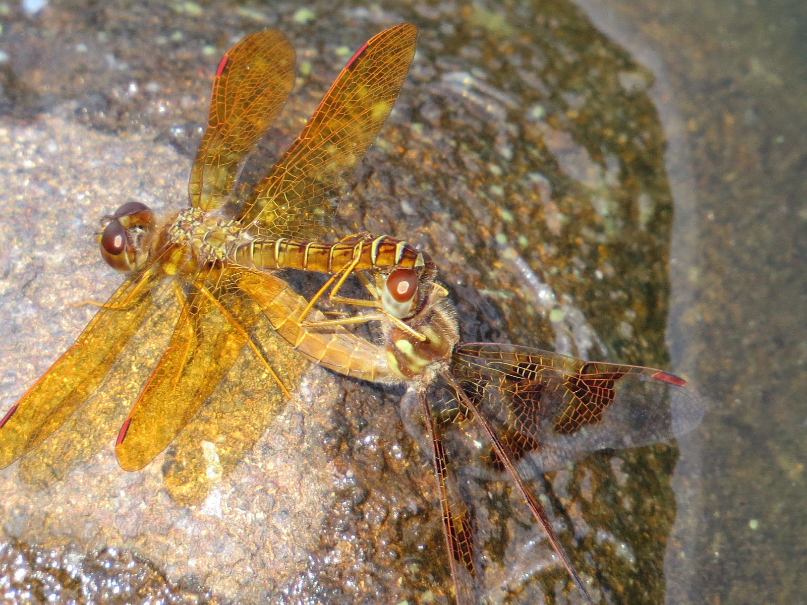 Eastern Amberwings (Perithemis tenera) in the reproductive wheel: the male holds the female by the back of the head; the female curves her abdomen up and forwards his genitalia, located (counterintuitively?) at the base of his abdomen.