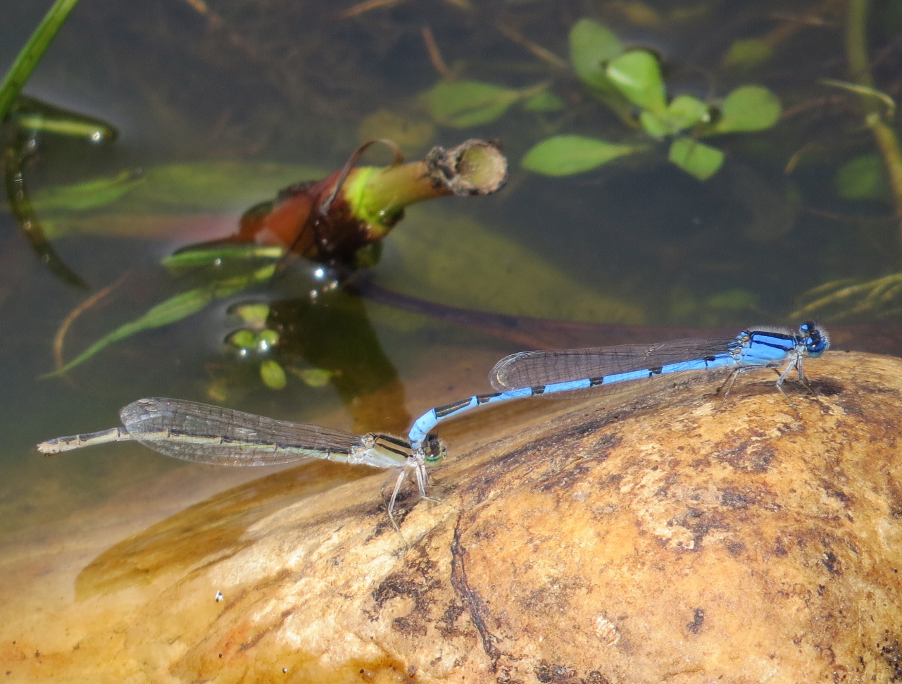 In some species of Odonates, the male will continue to hold the female after mating and through the egg-laying process, precluding another male from mating with her, as with these Familiar Bluets (Enallagma civile). They can fly in tandem like this. Some species’ males will scoop out a previous male’s sperm from the female before adding his own with his specially equipped penis.