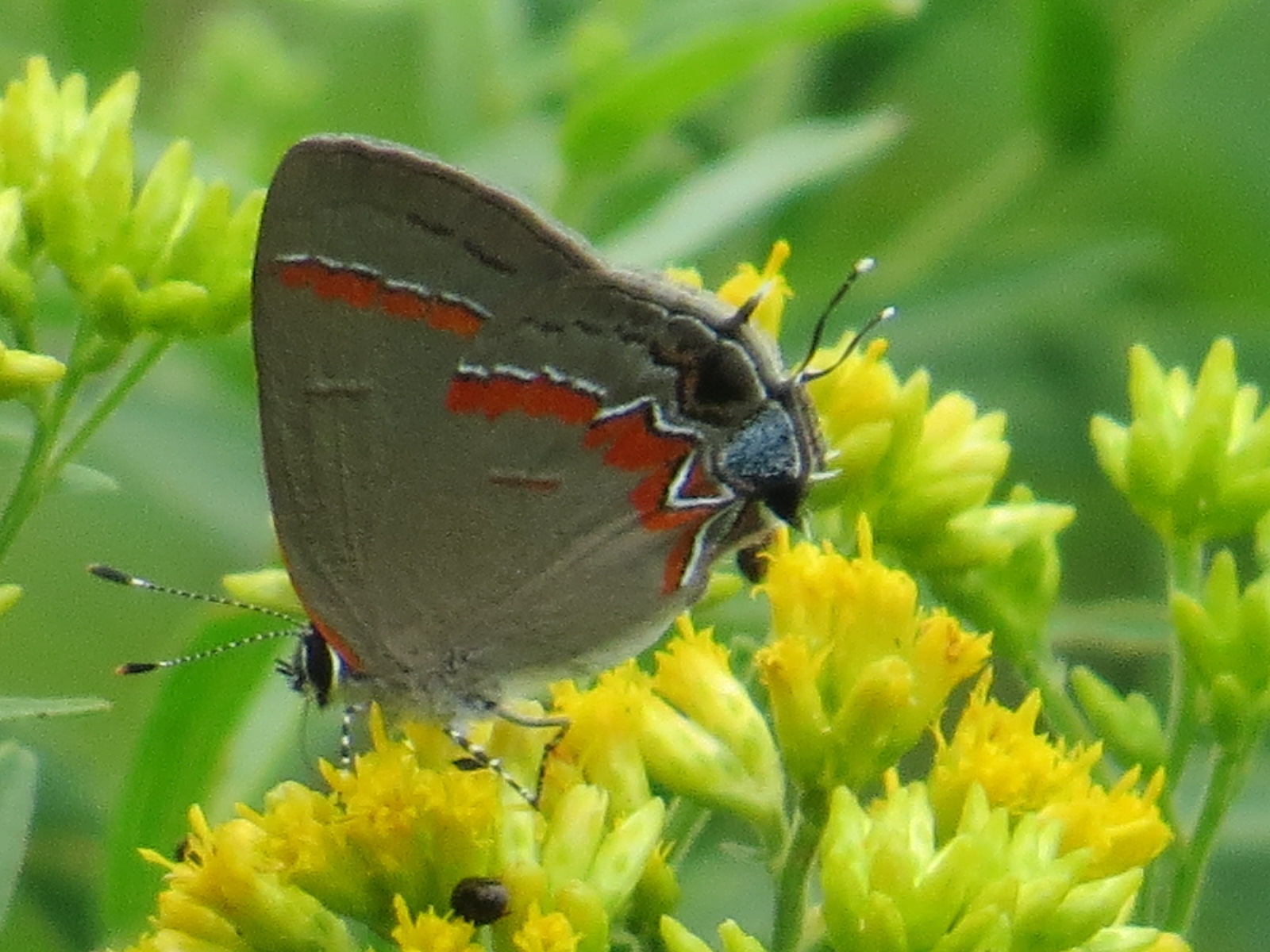 Red-banded Hairstreak (Calycopis cecrops). A species I’ve never seen before. This is the northern edge of its range; it is more common in the deep south. The “hairs” off the tail wagged in the air like antennae, and the spot looks vaguely eye-like. It was hard to tell which end was which, probably the point.