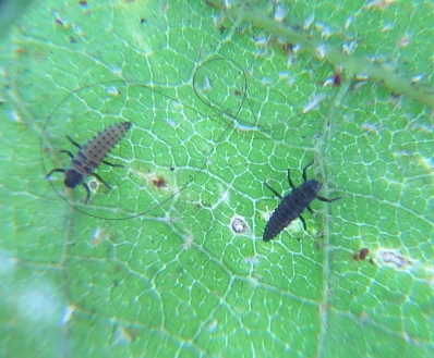 This photo and the one below are shot with my camera’s macro through a 10x loupe. The ‘gator-like larval stage ladybug — see the two spots on its side, like the adult Two-spotted — is surrounded by aphids; these aphids are so small they can barely be seen with the naked eye.