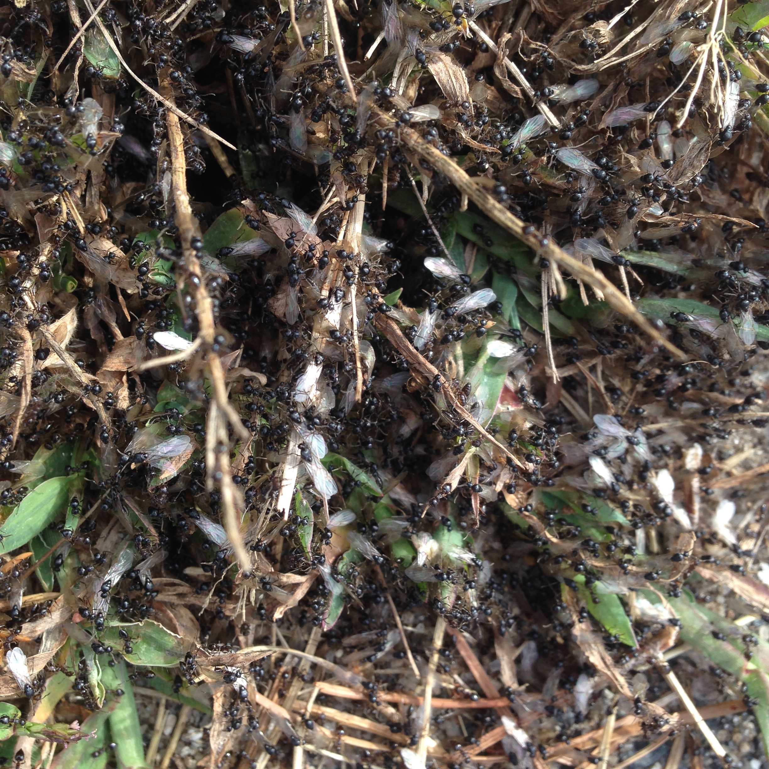 Hymenoptera, the insect order that includes the wasps, bees, and ants, are named after their “membrane wings.” But ants don’t have wings, at least not in the colony, where such appendages would get in the way. The reproductives, males and virgin queens, however, do have wings. The queens break their wings off after mating flights and start new colonies. The males, or drones, die off after their work is done. Last week, a subtle glittering in the grass caught my eye. It was this colony all a-flutter.
