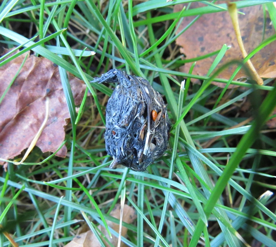 While perched, the bird threw up this pellet. Once she — the bird seemed so large I think it was female — flew off after the usual business with screaming Blue Jays, I scanned the ground below her. Owls are famous for their pellets — I have some in my freezer, long story — but all raptors and some other birds, like gulls, spit them up; they’re just not as famous, substantial, or long-lasting as owl pellets.
