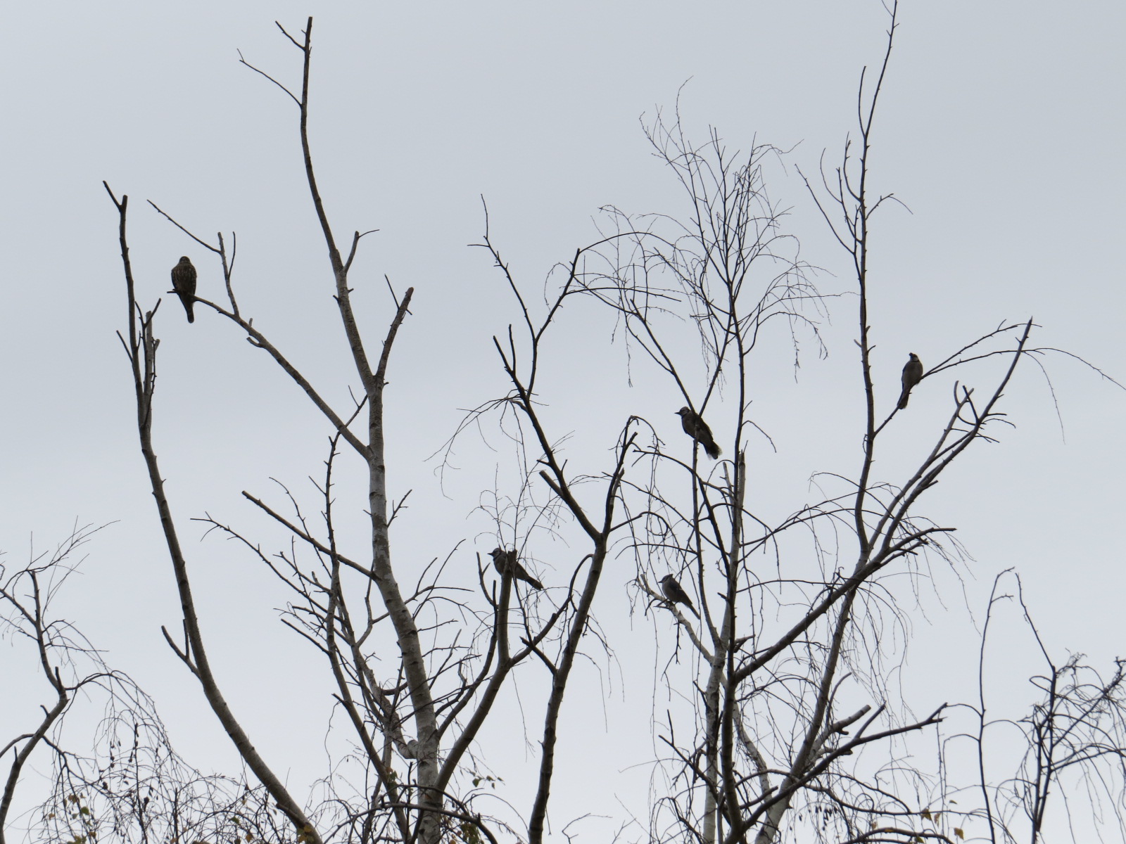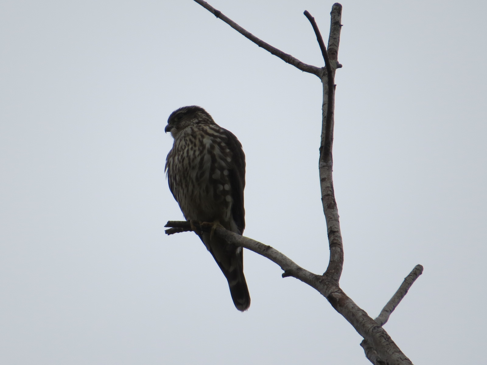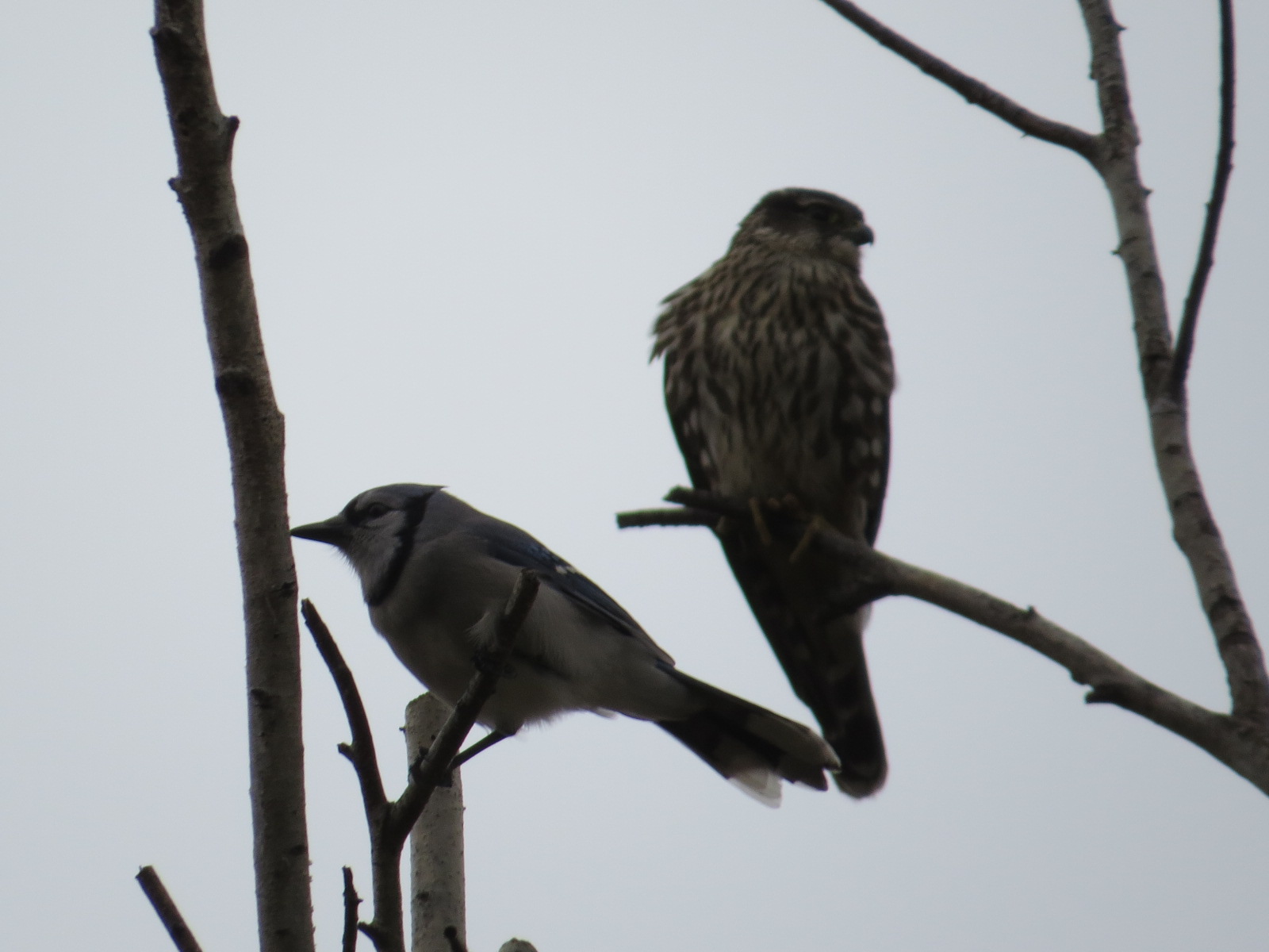I said recently that Merlins (Falco columbarius) were comparable in size to Blue Jays (Cyanocitta cristata). Ummmm, well…. That’s a Merlin on the upper left. The other birds are Jays. Up to seven were in the tree recently on a very gray day, harrying the falcon until it flew off.