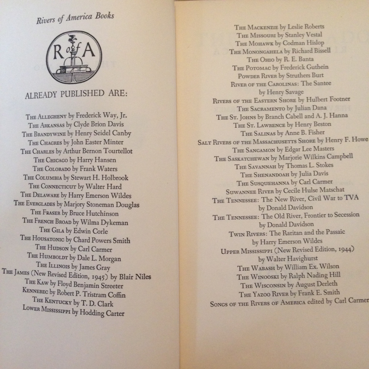 The Rivers of America series started in 1937 and ended in 1974. Sixty-five books were ultimately published. I recently tried reading the volumes on the Hudson, the Colorado, and the St. Lawrence, but I couldn’t get past the first chapter of any of them. They were too Forties for me, a whitewashed, cheerleading view of history. Ah, well.
