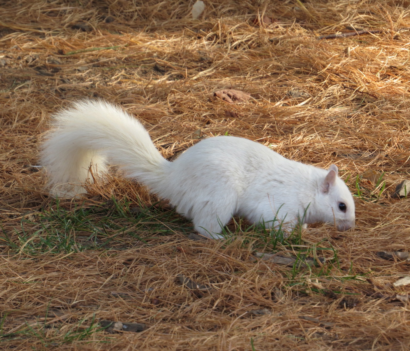 We have a small cadre of these guys out here–where the usual squirrels are gray, no reds or blacks. When I first saw one of them, running, I thought it was my white cat. Same thing when I saw our all white skunk running. Some of our skunks are black and white, and some are white and black.