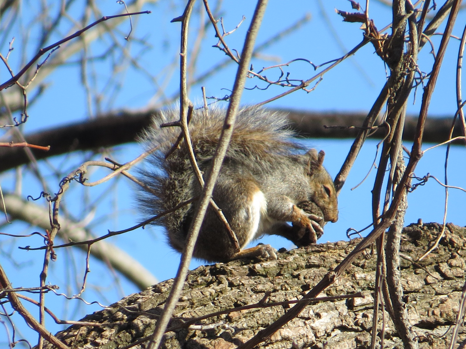Over all, the wind in the trees, like an overtone. Cardinals chipping. Blue Jays screeching. Two trees, or perhaps trunks of the same, rubbing together. The tapping of a woodpecker. White-thoated Sparrows scratching in the leaves. The gnawing of a squirrel on a nut.