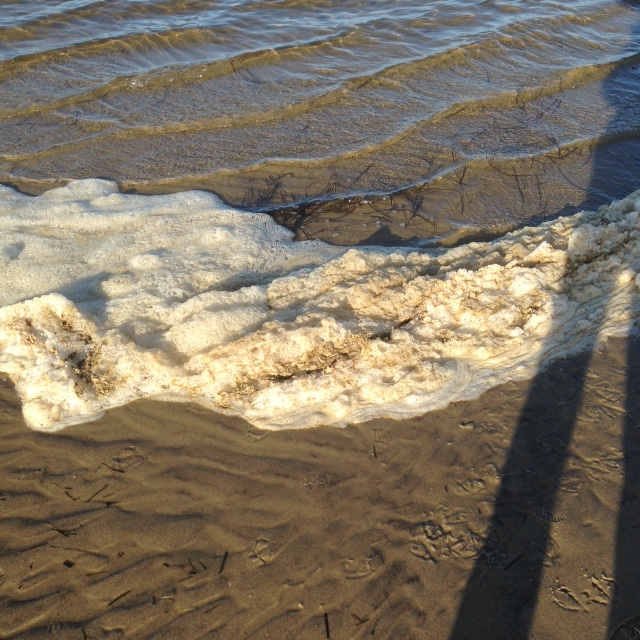 Sea foam lapping along a bayside. This froth is created the agitation of dissolved salts, proteins, fats, dead algae, and other organic matter churning around in every ounce of sea water.