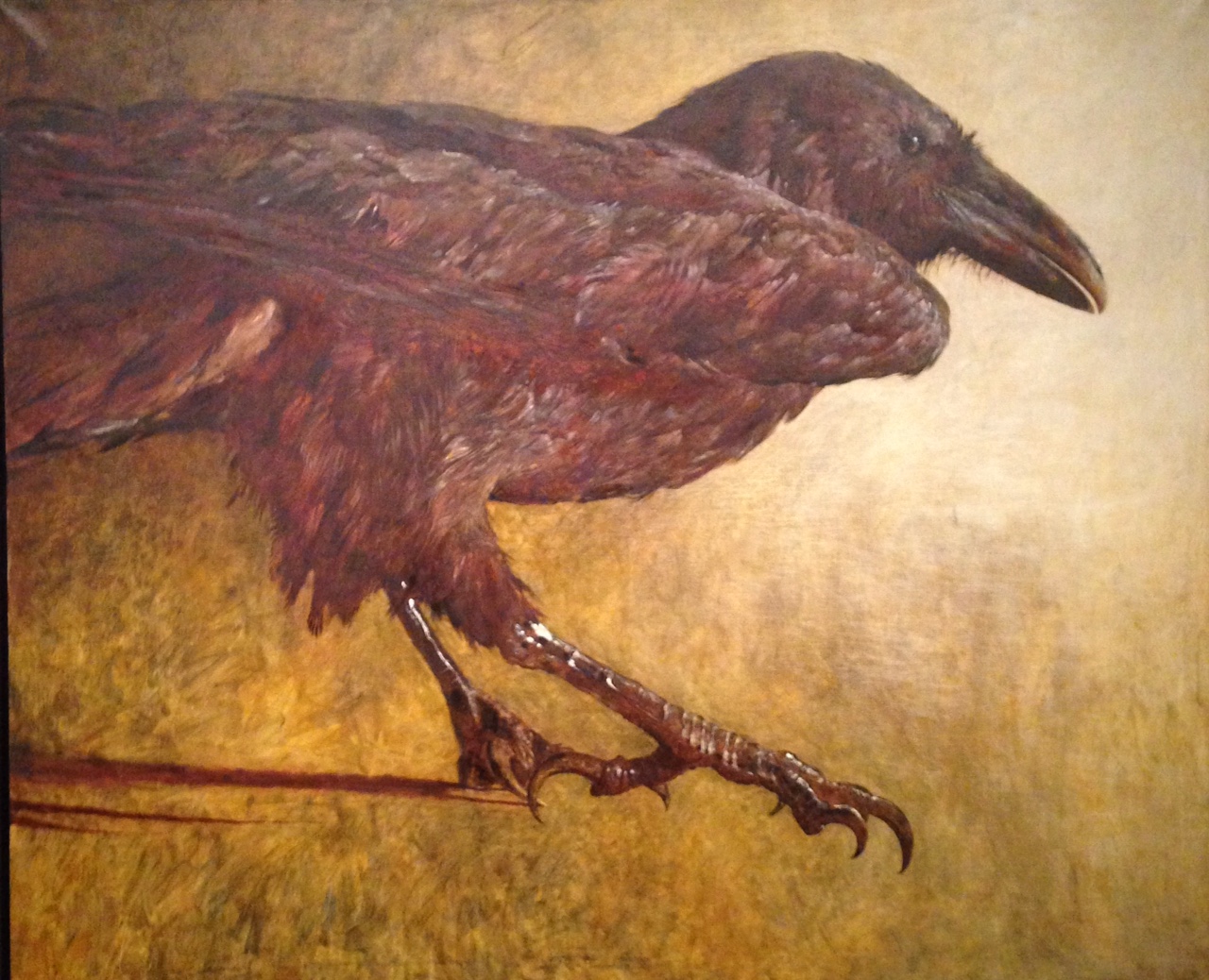 Jamie Wyeth’s painting “Raven,” at the show ending this month at the Museum of Fine Arts, Boston. This is a large painting, something such images on the little screen never convey. Here’s what it looks like in context. By the way, Wyeth’s Herring Gulls are pretty good, too. Evidently he is obsessed with their eyes.