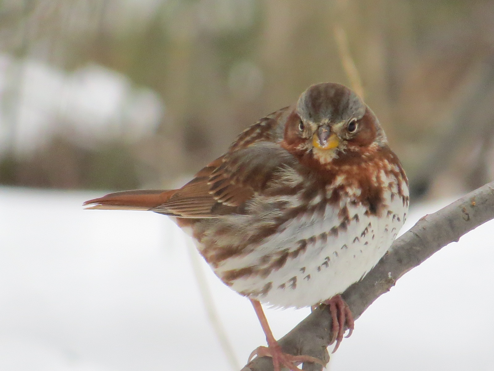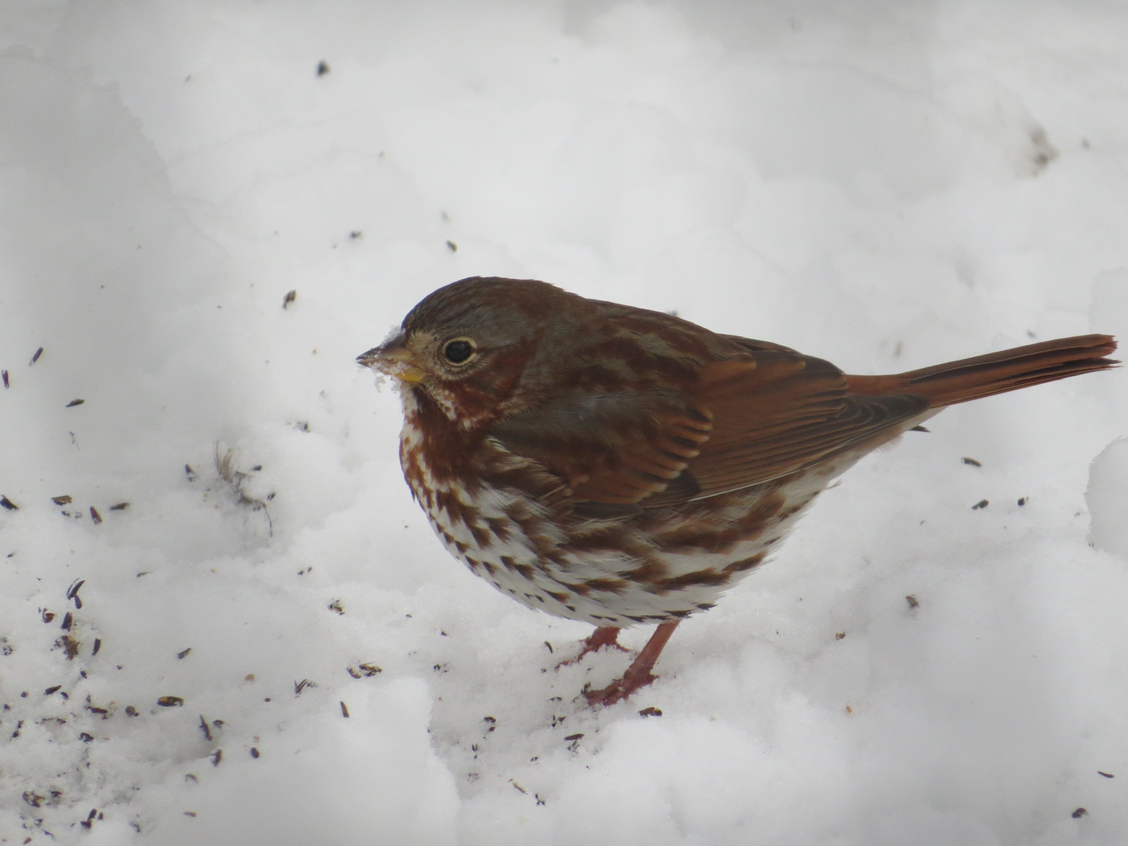 A couple of Fox Sparrows (Passerella iliaca) were out from under the usual undergrowth they like to kick up in. The species visits us in winter, but not in great numbers. Their russet red plumage is a nice contrast to other sparrow species, and quite tell-tale.