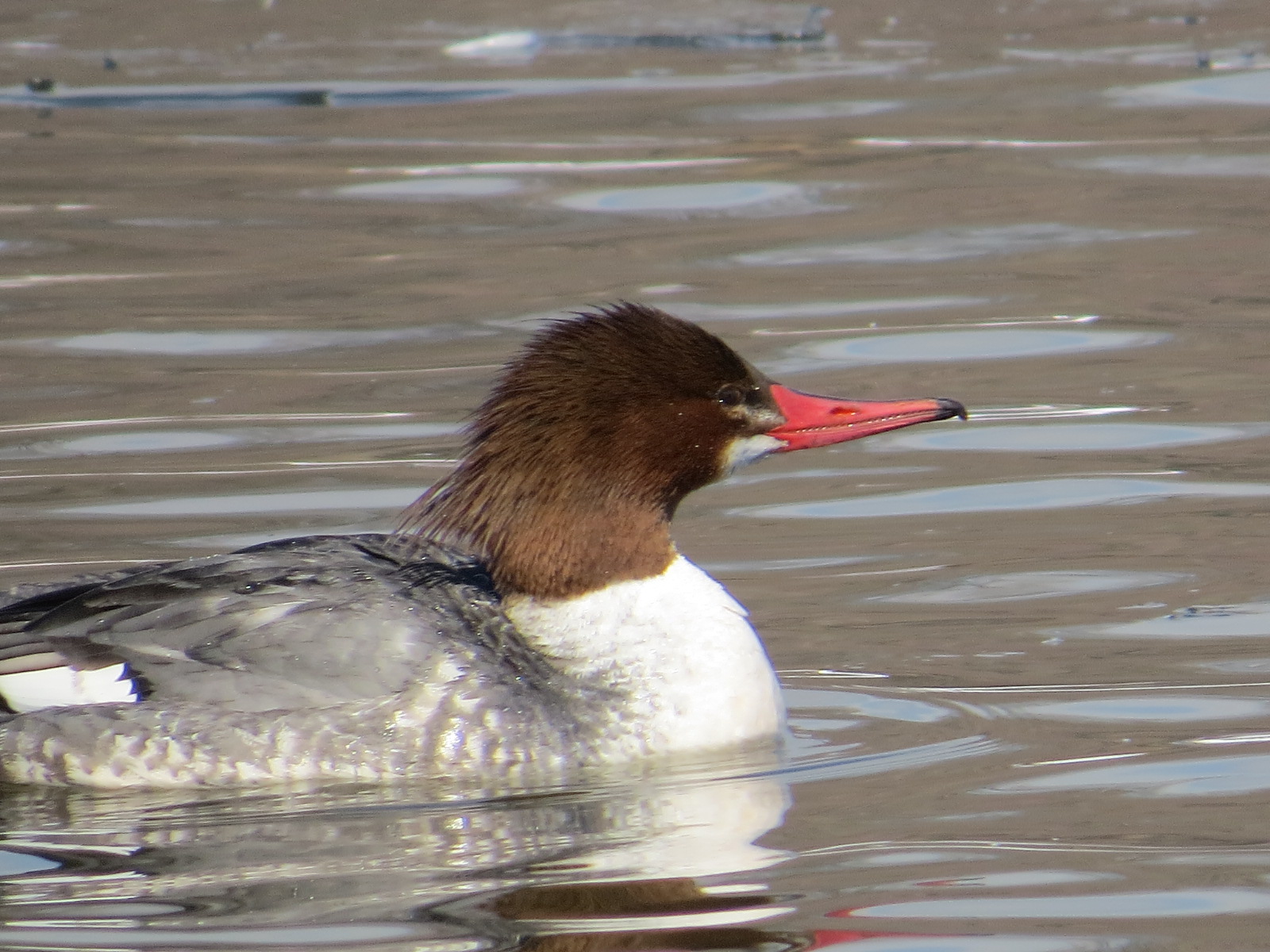 Sometimes mergansers (we have three species: Hooded and Red-breasted are the other two) are known as sawbills for the teeth-like serrations on their bills, best seen on the picture of the female, which help them grip slippery fish prey. I assume the amazing hook at the tip here is also useful for snagging scaly meals.