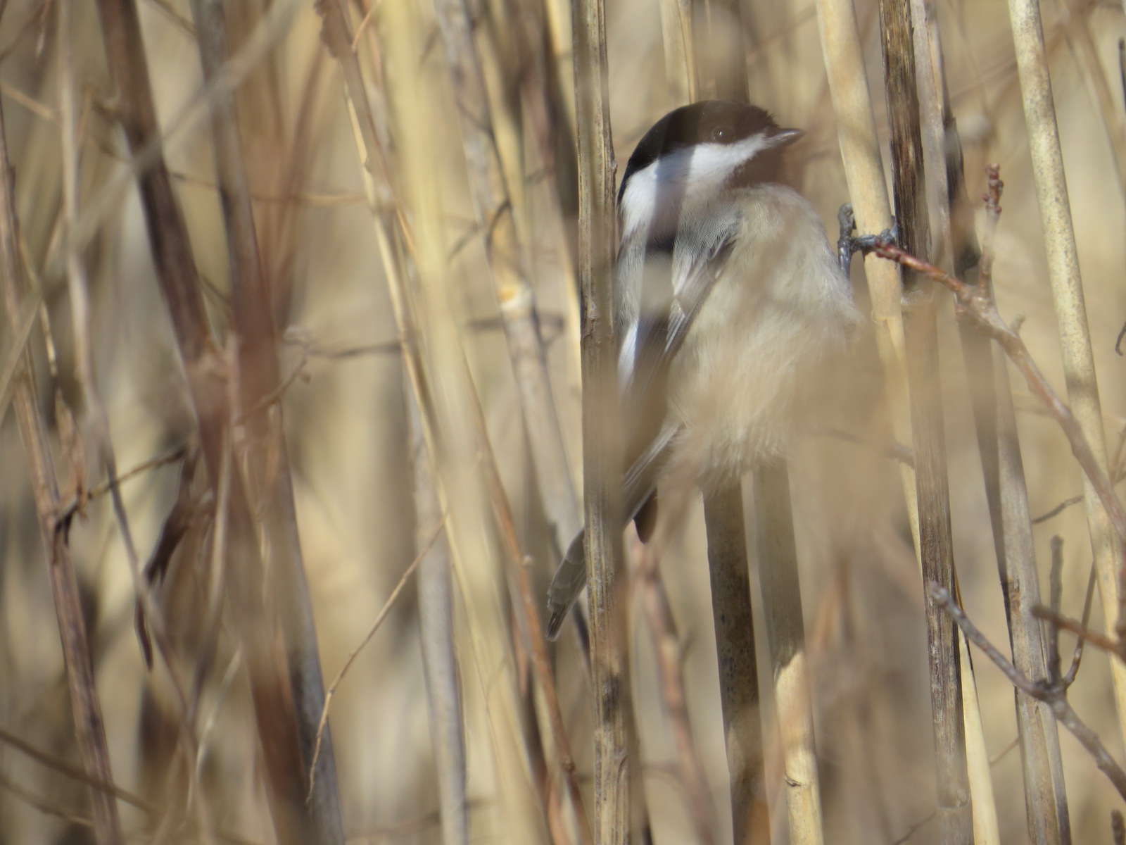 It’s certainly photogenic, if nothing else. You don’t find much life in a patch of Phragmites, although Downy Woodpeckers and, as here, a Black-capped Chickadee in winter extremis, peck and poke among the dry stalks for evidence of invertebrates.