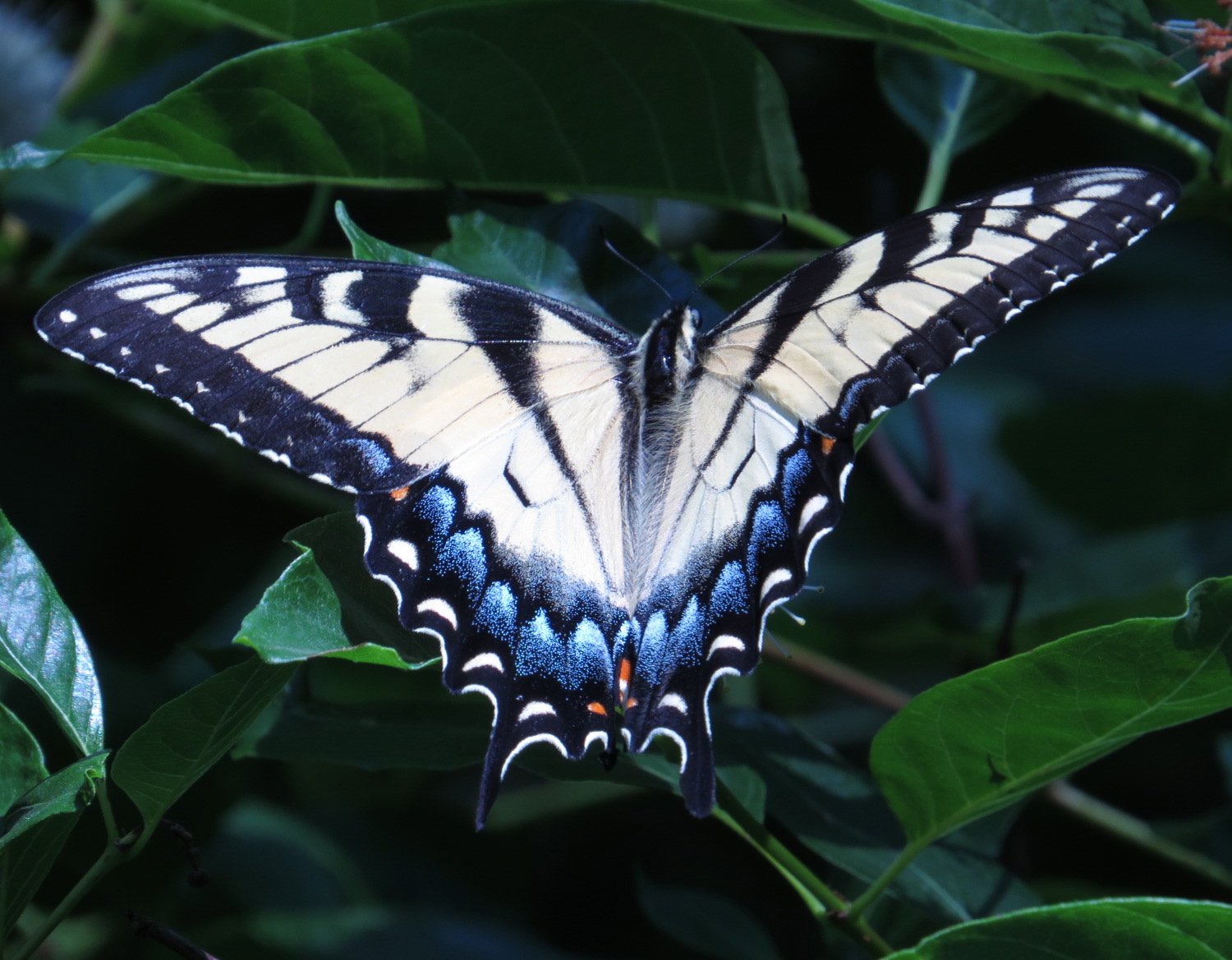 But, actually, it’s the larva of the Eastern Tiger Swallowtail (Papilio glaucus), that gloriously large yellow and black butterfly. Early instars, or stages, of this caterpillar look like bird droppings (that old camouflage trick!); middle ones are vivid lime green, with the false eye spots; the last before pupation will look like this. Tuliptree, magnolia, and black cherry are among the food plants for this species; this was next to a Tuliptree (Liriodendron tulipifera), which is an unusual street tree here. Like all caterpillars, it is a machine for eating, powering up for the biochemical alchemy of metamorphosis.
