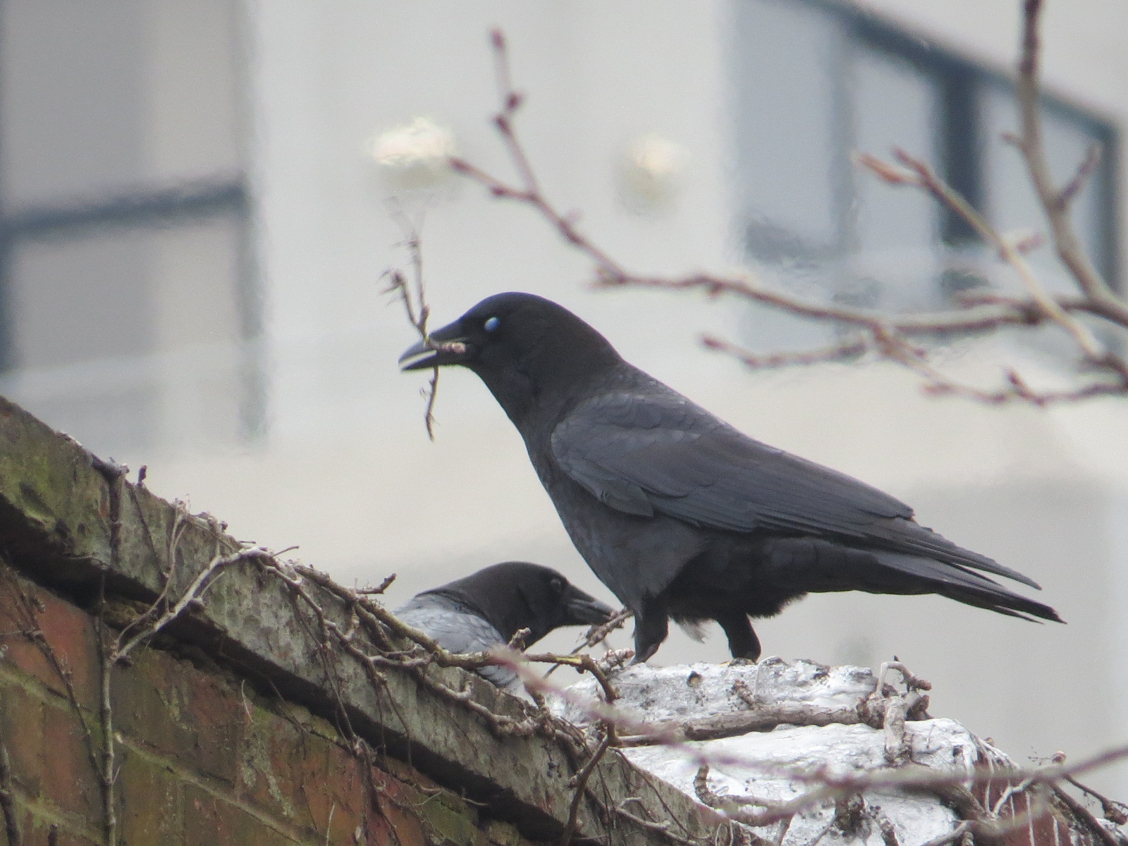 On Saturday, I watched three gathering nest material around Joralemon St. Two of the birds were picking up sticks from some kind of wintery vine that had crawled up the side of a house and reached over the top. The third bird was… what, acting as lookout, scout? Crows often maintain multi-generational family units, with a yearling or two sticking around the help the parents with raising a new generation. It is rare to see a lone Crow — “one is for sorrow” according to the old rhyme, but pshaw to that!; look closer, that lone black bird could be a Raven.