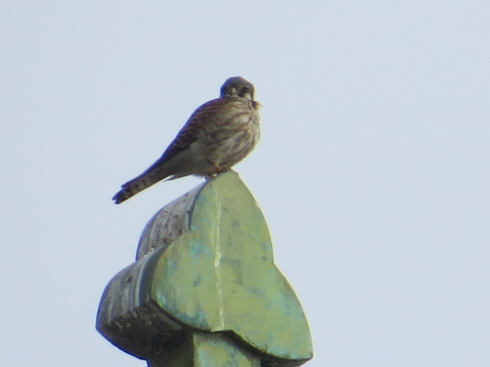 A rumor of an American Kestrel being heard and seen on Montague Street had my falcon-senses tingling Saturday. Exploring one of the alleys south of Montague, I faintly heard one of the birds, almost subliminally, just enough to make me look up: the little jet sliced the sky in half. Around the corner — voilà! — this female Falco sparverius was perched atop St. Borromeo. This is a fine falcon perch; the accretion of droppings up there suggest other birds like this venue, too.