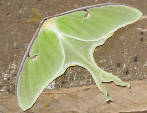 Checking out of our fog-bound Catskills hotel, we were greeted with a luna moth on the veranda. One of the giant silk moths, Actias luna is large, startling, and spectacular. (See the comments for the status of these show-stoppers here in the city.)