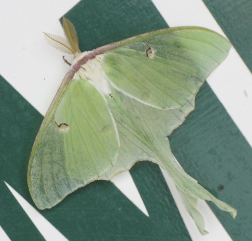 Checking out of our fog-bound Catskills hotel, we were greeted with a luna moth on the veranda. One of the giant silk moths, Actias luna is large, startling, and spectacular. (See the comments for the status of these show-stoppers here in the city.)